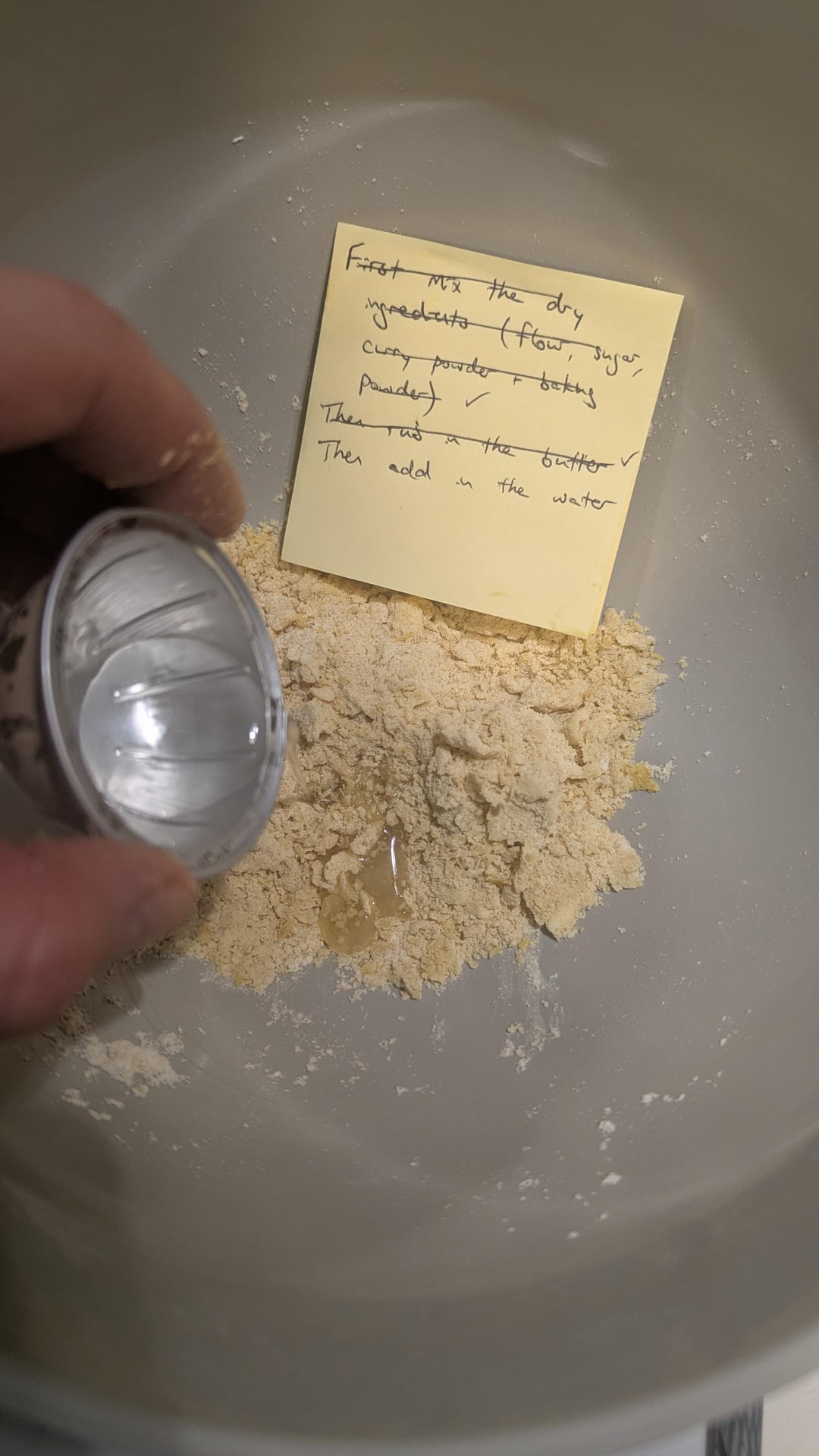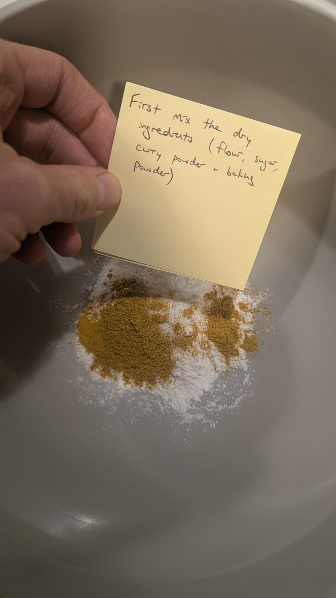 First mix the dry ingredients (flour, sugar, curry powder + baking powder)