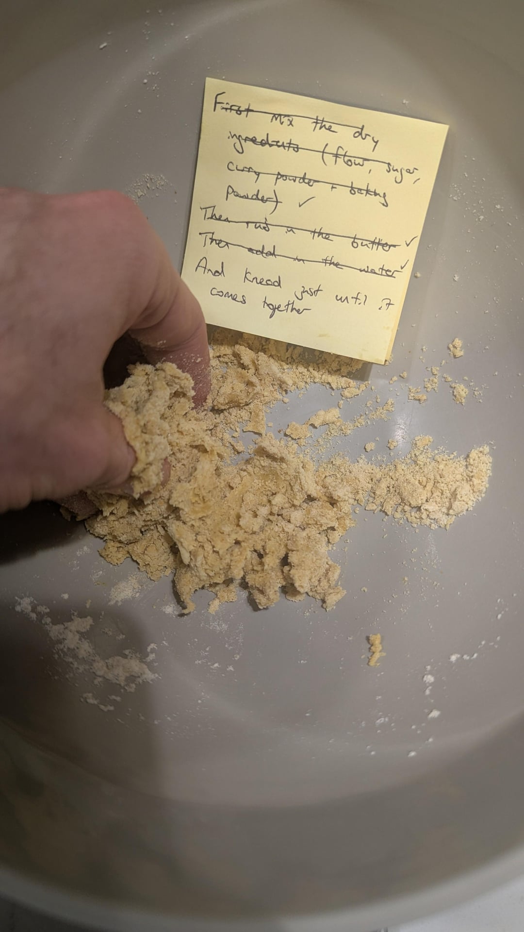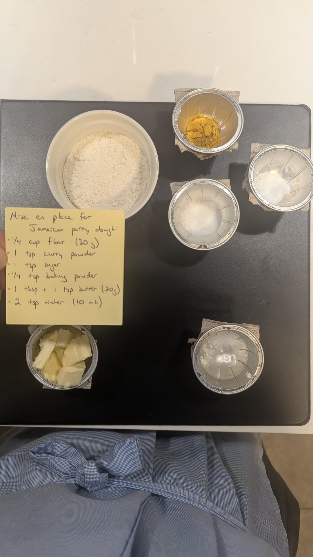 Mise en place for Jamaican patty dough: – ΒΌ cup flour (30g) – 1 teaspoon curry powder – 1 teaspoon sugar – ΒΌ teaspoon baking powder – 1 tablespoon + 1 teaspoon butter (20g) – 2 teaspoon water (10 ml)
