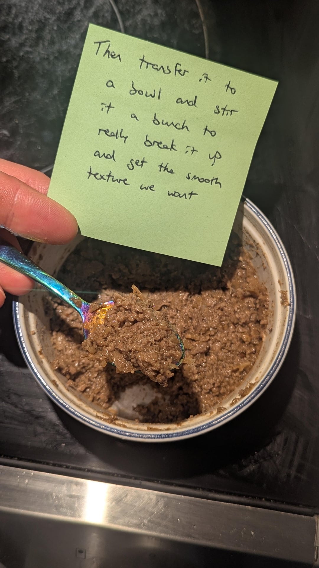 Then transfer it into a bowl and stir it a bunch to really break it up and get the smooth texture we want