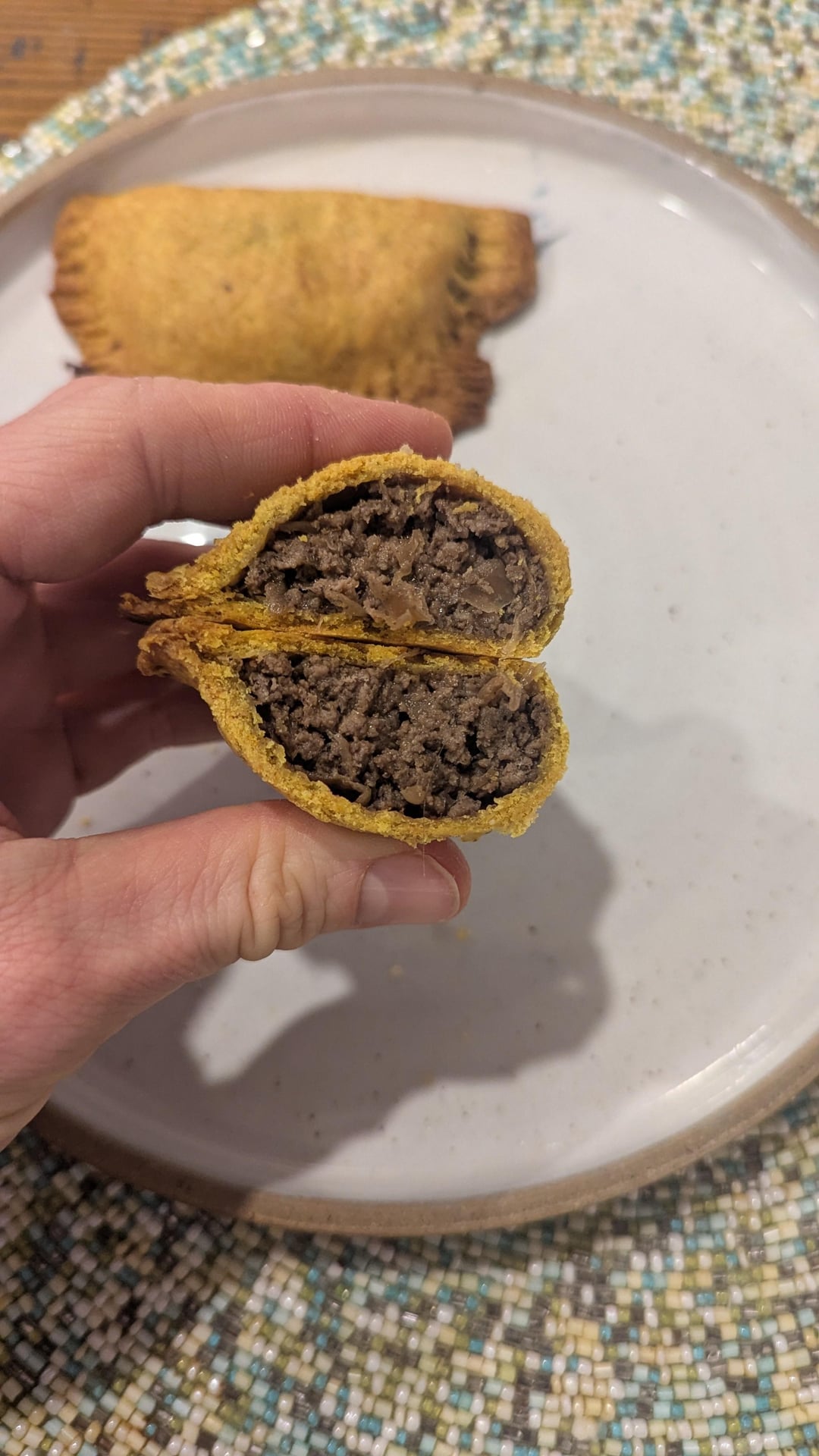 This version makes about 8β10 patties (perfect for a cozy dinner or snacks). It features a buttery, flaky crust with Jamaican curry powder and turmeric for that bright color, plus a juicy, well-seasoned beef filling with onions, garlic, ginger, thyme, and a touch of heat.