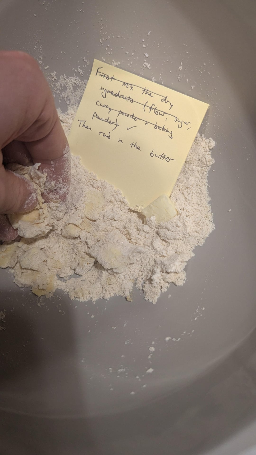 β’ Add the cold butter cubes (or grated butter). Use a pastry cutter, forks, or your fingers to work it in until the mixture looks like coarse crumbs with some pea-sized pieces remaining (this creates flakiness).