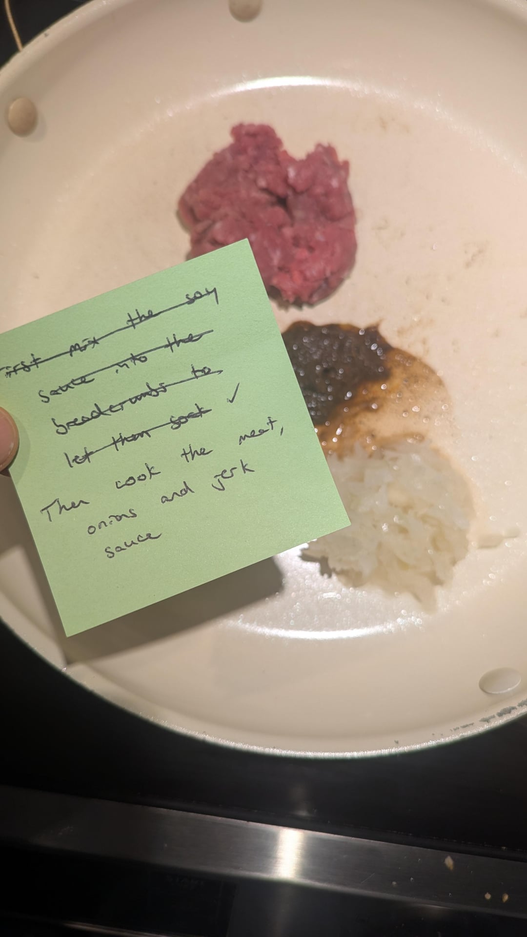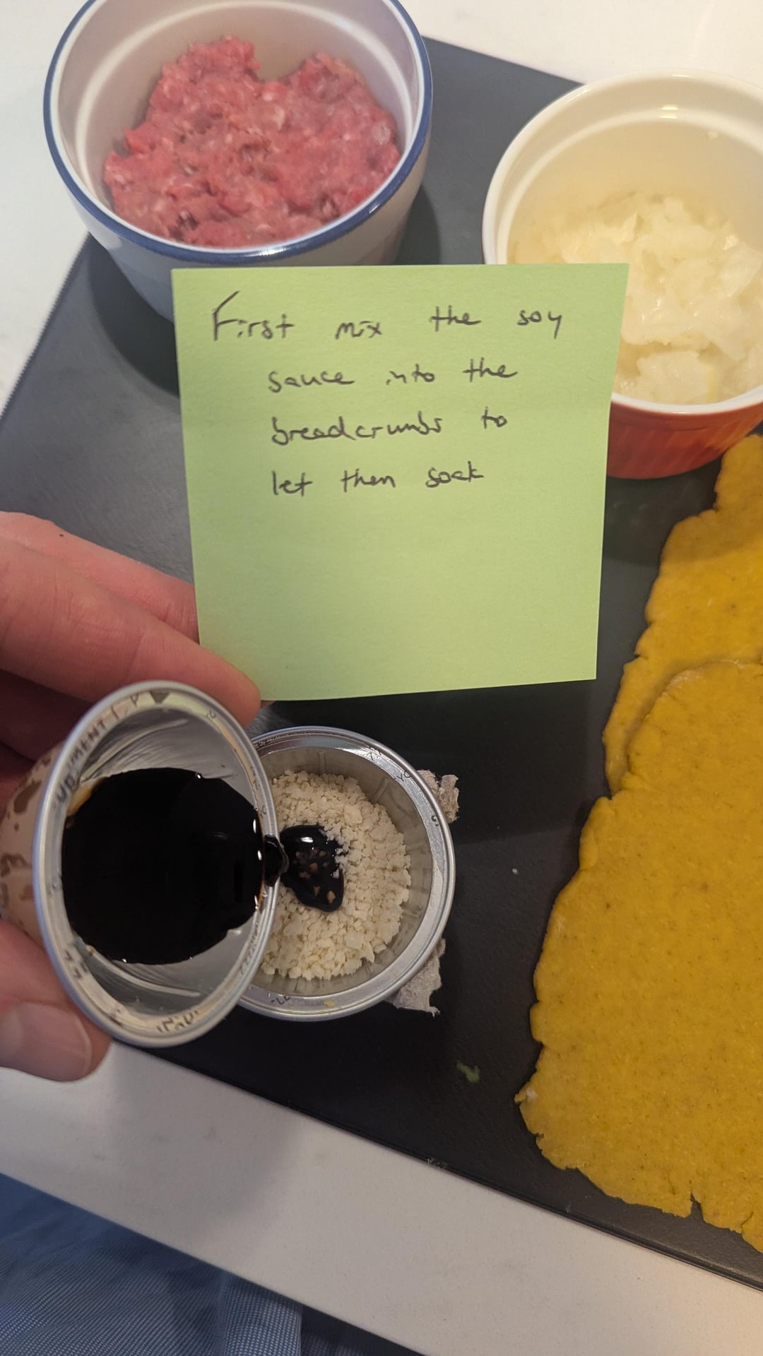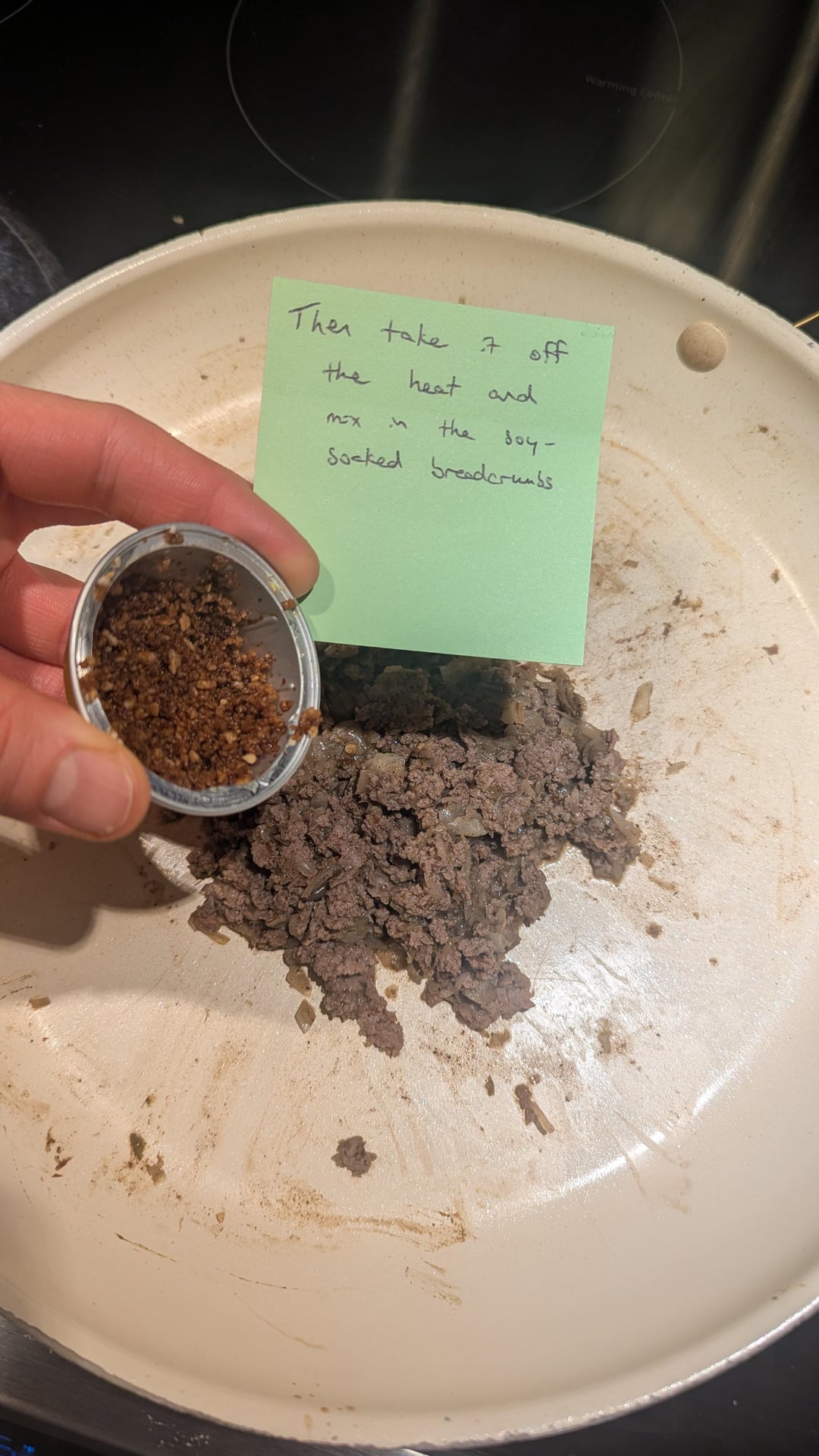 Then take it off the heat and mix in the soy soaked breadcrumbs