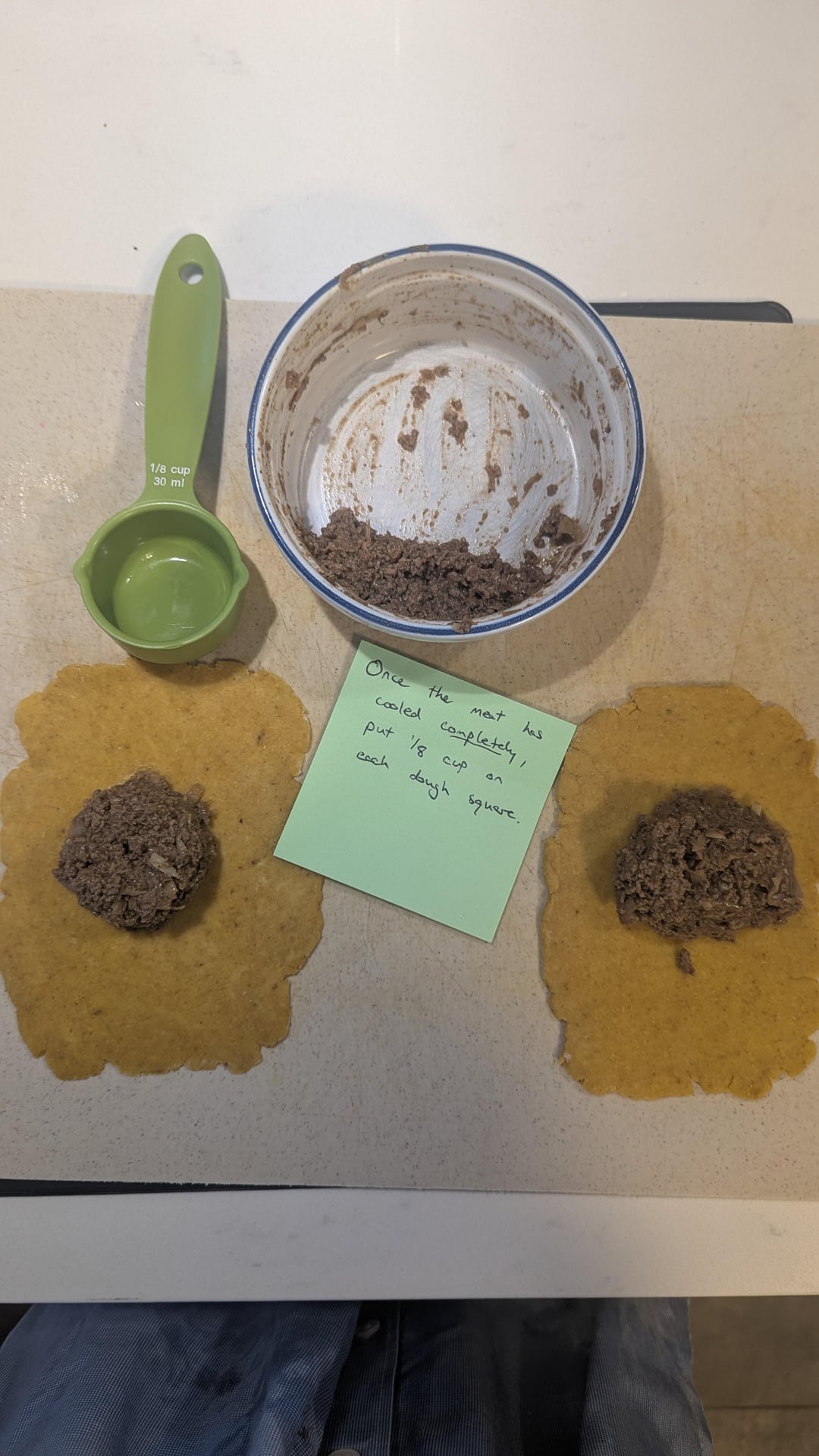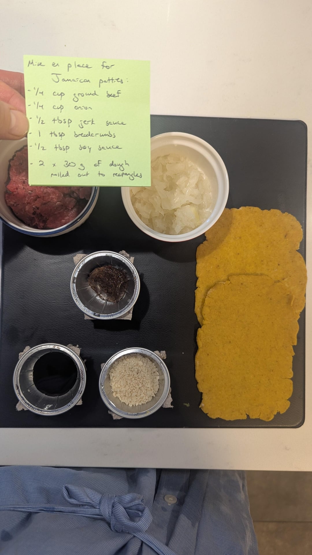 Mise en place for Jamaican patties filling: – ΒΌ cup ground beef – ΒΌ cup onion – Β½ tablespoon jerk sauce – 1 tablespoon breadcrumbs – Β½ tablespoon soy sauce – 2 x 30g of dough rolled to rectangles