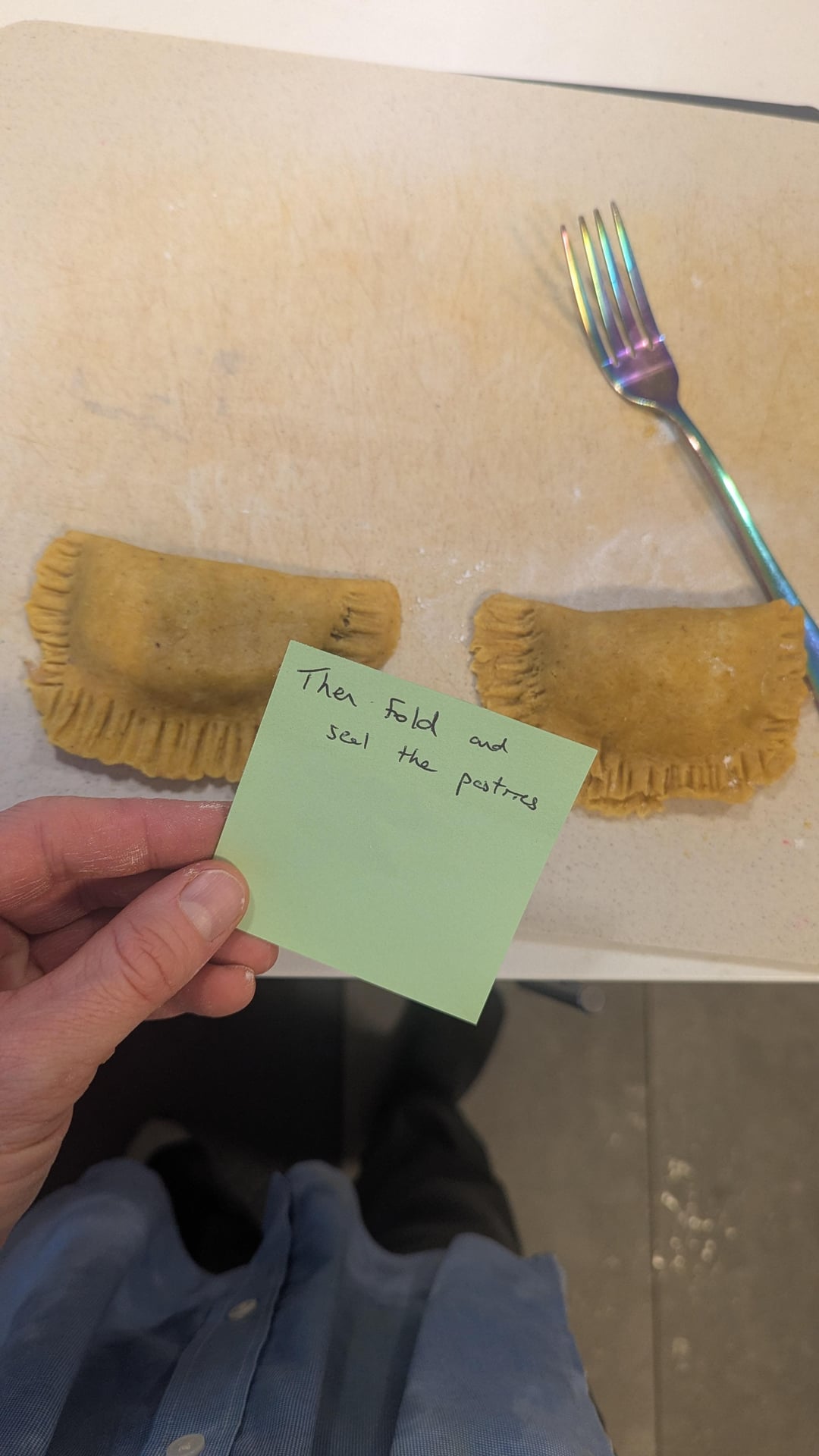 β’ Place 2β3 tablespoons of cooled filling on one half of each circle, leaving a border. Fold the other half over to form a half-moon shape. Crimp the edges with a fork to seal (or use your fingers for a braided look).