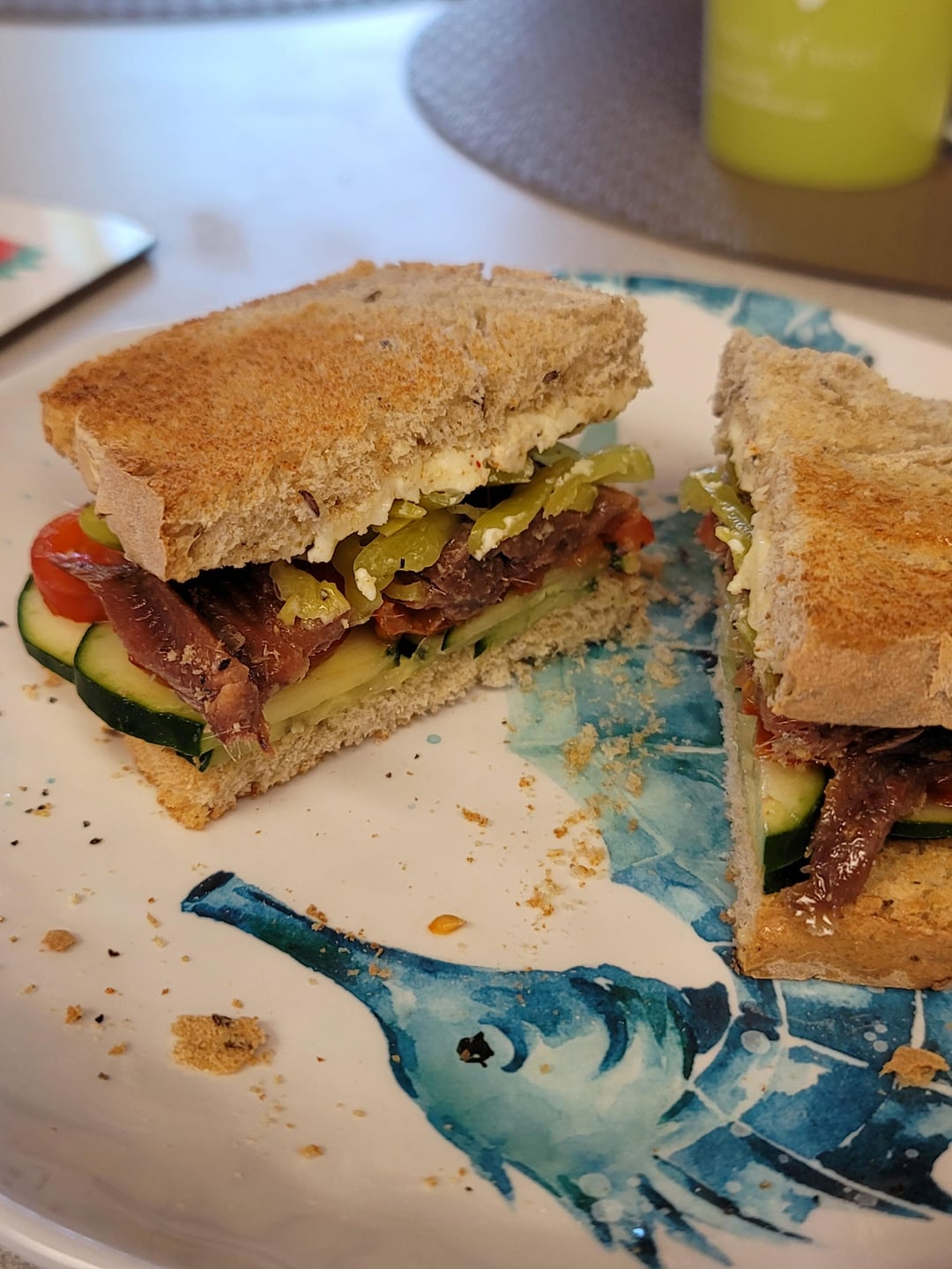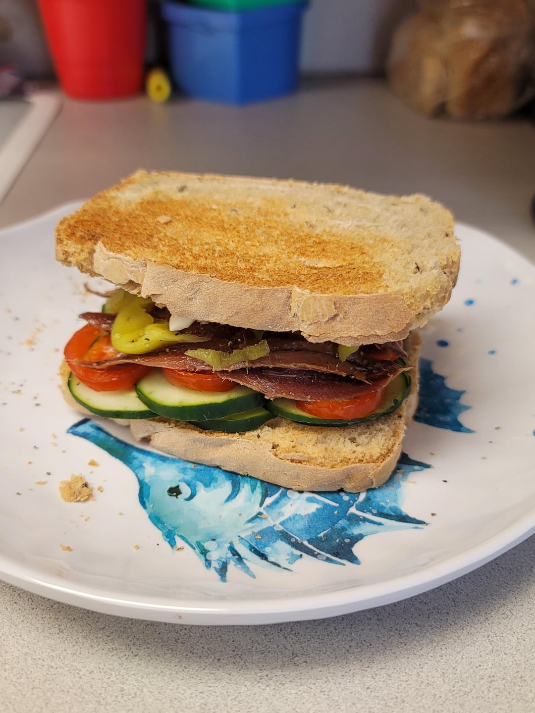 Went with an anchovy sandwich today. Cucumbers, tomatoes, pepperoncinis, pepper, Smack Yo Mama Cajun powder, and brie. by batmanineurope 9 Comments _iosefka_ 1 day ago Looks lush but imma need a tall glass of water with all that salt! ledgreplin 1 day ago Hot damn! Callicarpio 1 day ago Love the plate! Zombieutinsel 1 day ago Sardine sammich….First time I’ve ever heard of that was in a crazy song about the Titanic.https://youtu.be/4XFYMjkFYPg?si=YtHVnMJvS4Jk58eQIt’s long but awesome sam_the_beagle 1 day ago Gotta have something oniony. But the brie is genius! Perfect for soaking up some of the saltiness. I gotta try brie. vee_saltt 1 day ago That looks delicious! I love salty food AdRadiant9379 1 day ago I’d eat it up stefanica 1 day ago I’d probably swap the Brie for cream cheese, but doesn’t sound bad. little_mountainchef 1 day ago I like Mascarpone with my anchovies !