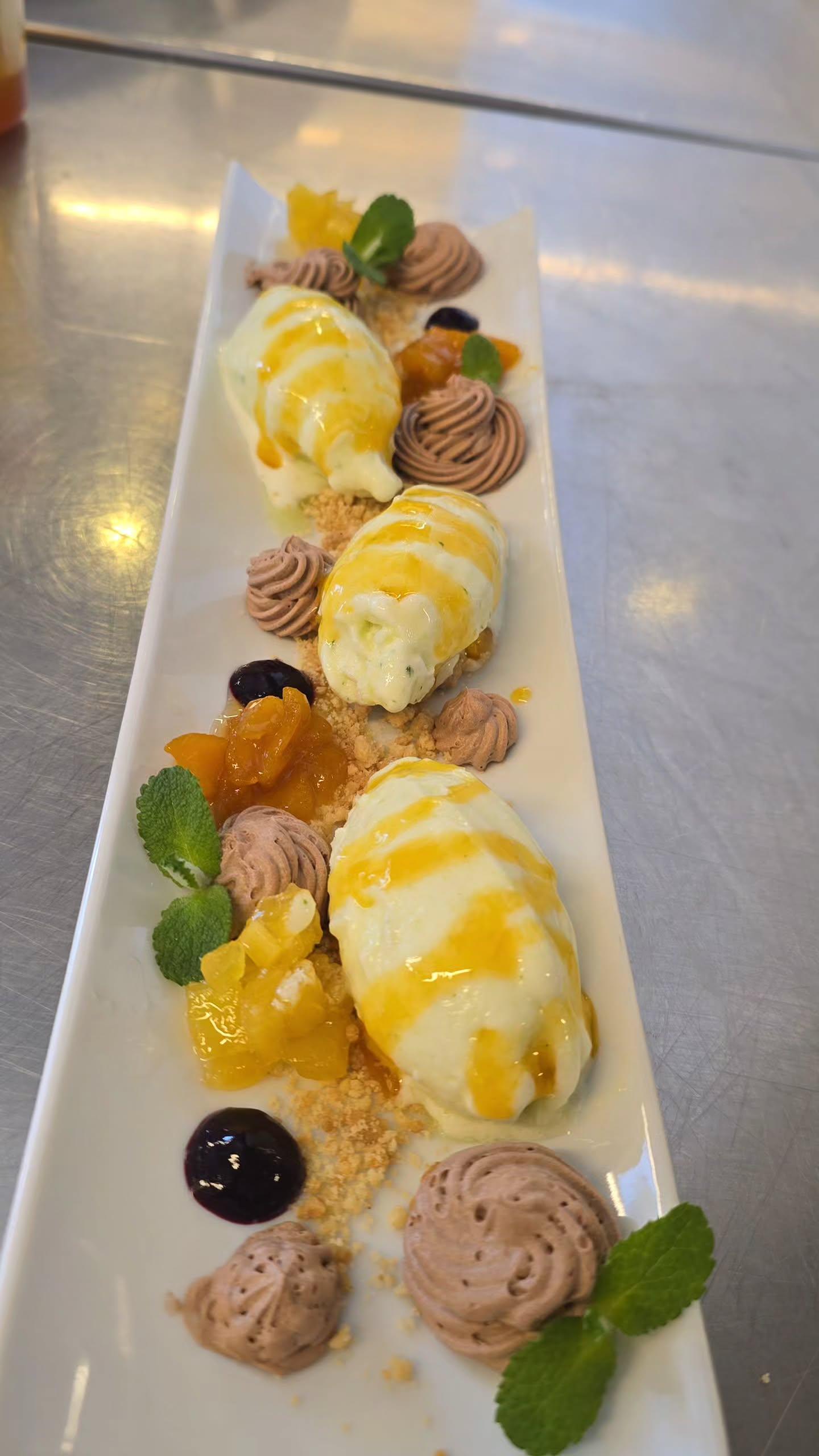 I made lemon and mint quenelles, mango coulis, and chocolate mousse