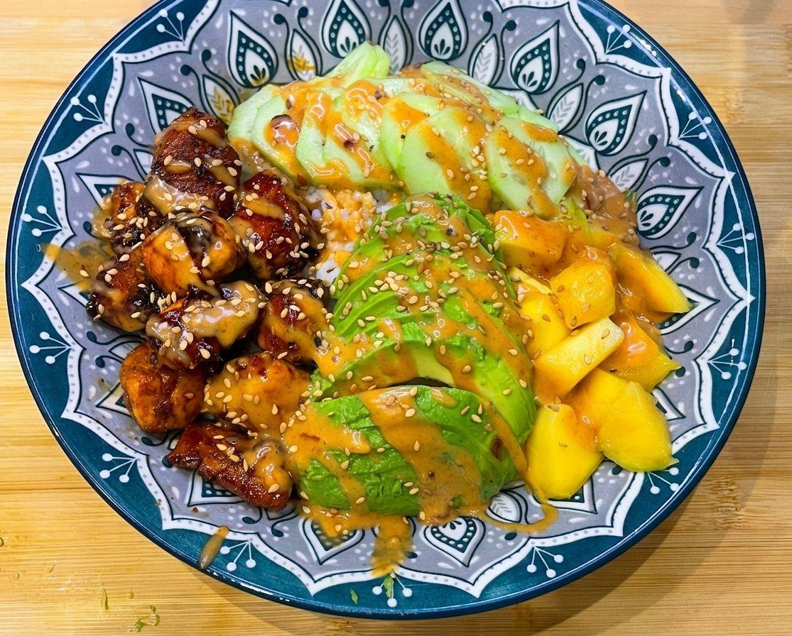 - Add fresh toppings: Finish the bowl with sliced cucumber, mango cubes, avocado, a drizzle of spicy sauce, and a sprinkle of sesame seed