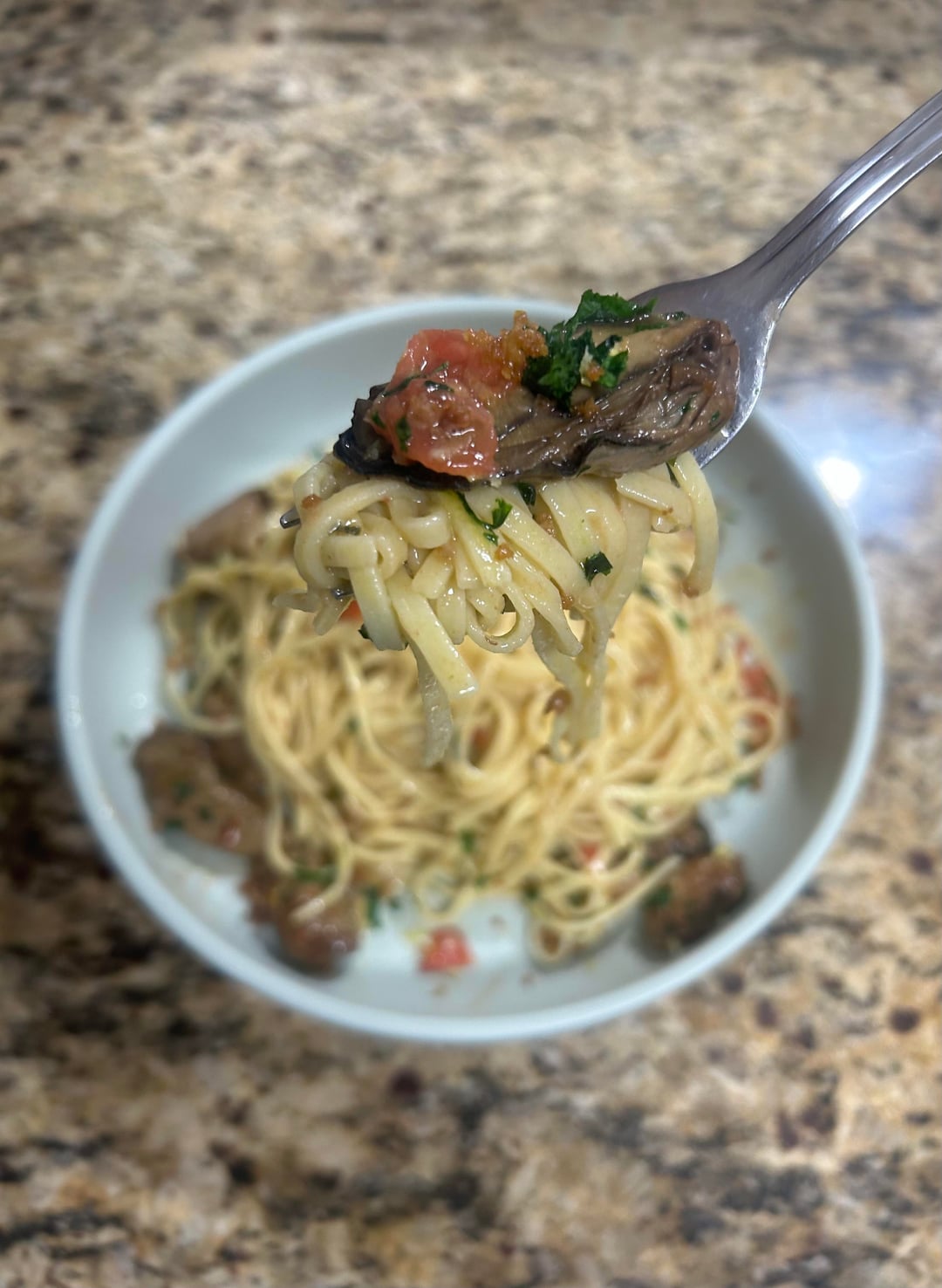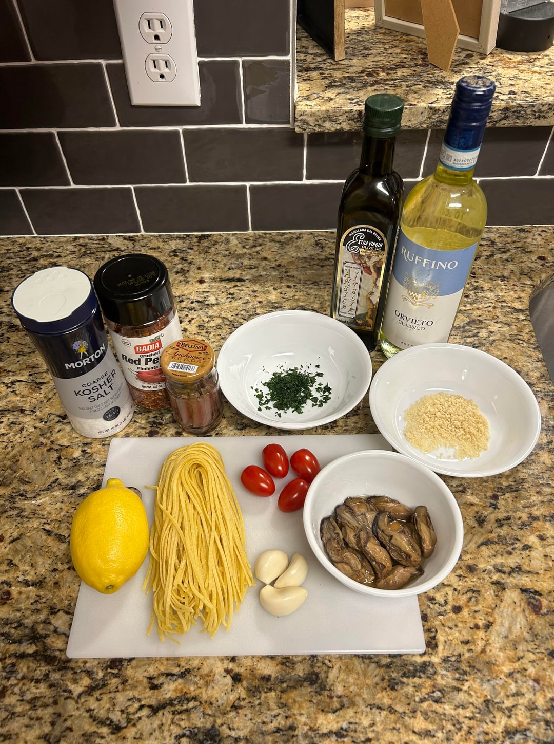 Ingredients: Fresh linguine, smoked oysters, garlic, grape tomatoes, anchovies, olive oil, white wine, bread crumbs, parsley, pepper flakes, salt, lemon