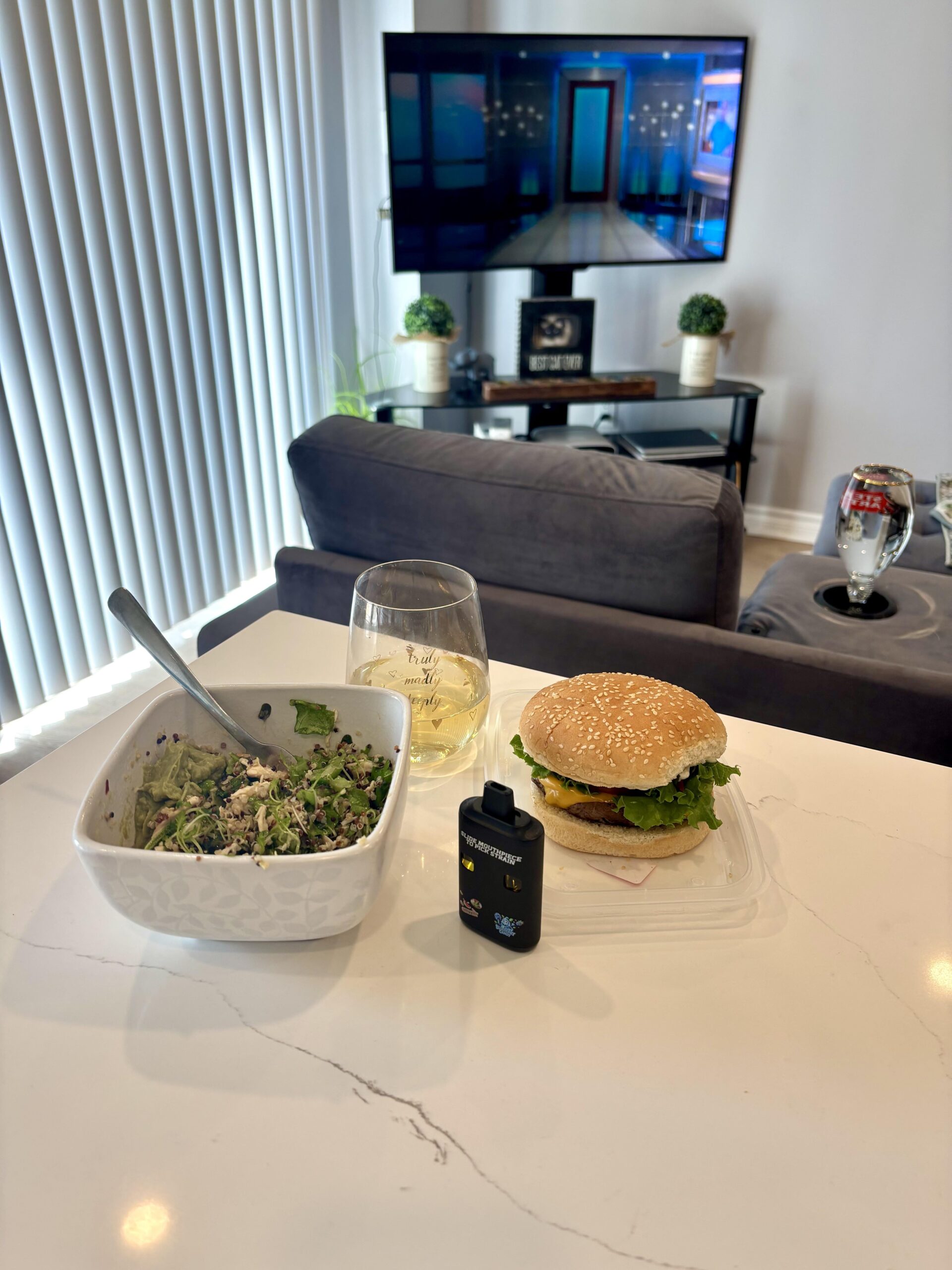 I have a sleeve of the Kirkland burgers in my freezer and I’m craving them often lately lol. Of course, have a random side 😂 today was boston lettuce, micro greens, rotisserie chicken, quinoa, guac and a garlic lemon vinaigrette. As always, my favourite vape and wine 😊 watching an old season of Big Brother tonight!
