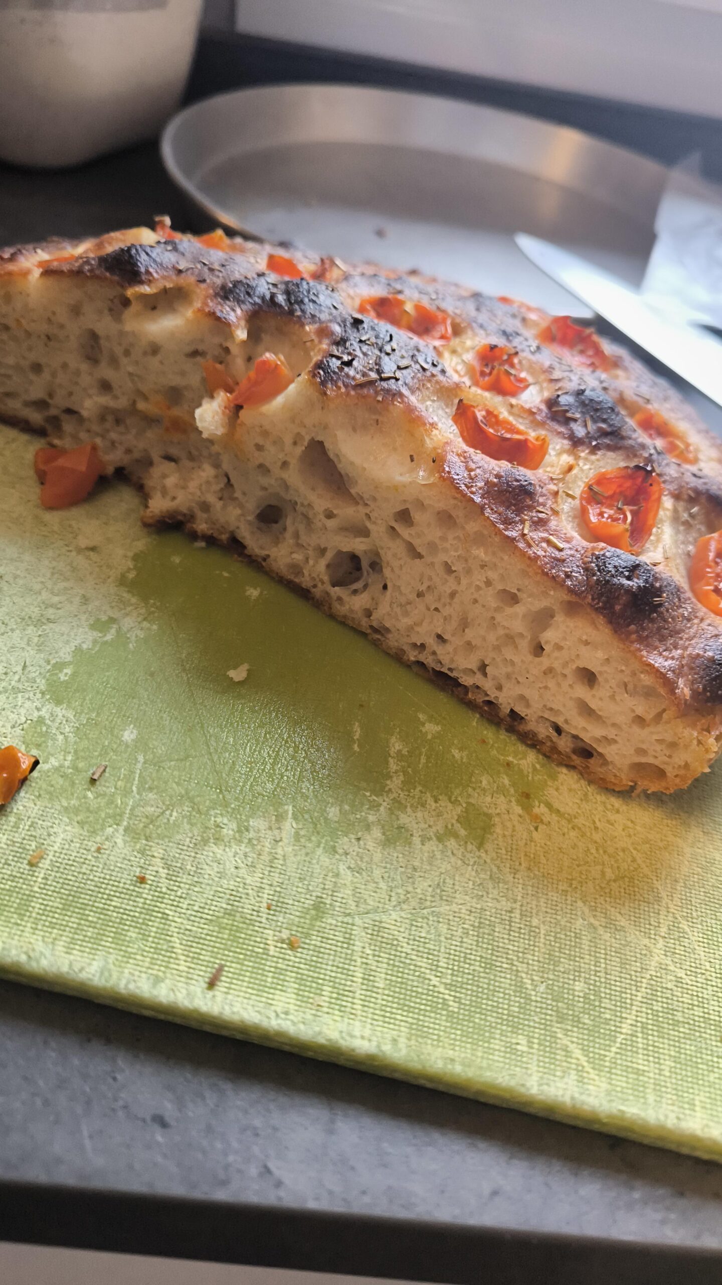 Typical from south of Italy (Puglia) is made with re-milled durum wheat semolina, white AP flour, Mashed boiled potato and sourdough starter, salt, olive oil. Decoration with little tomatoes and oregano. It typically don't last until the day after…