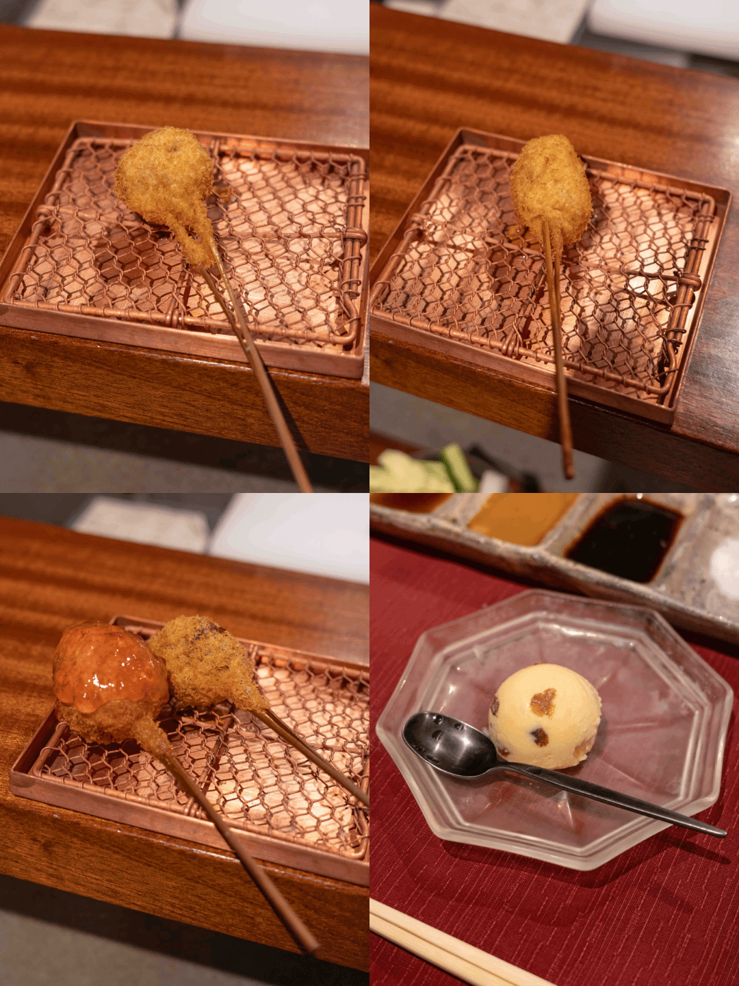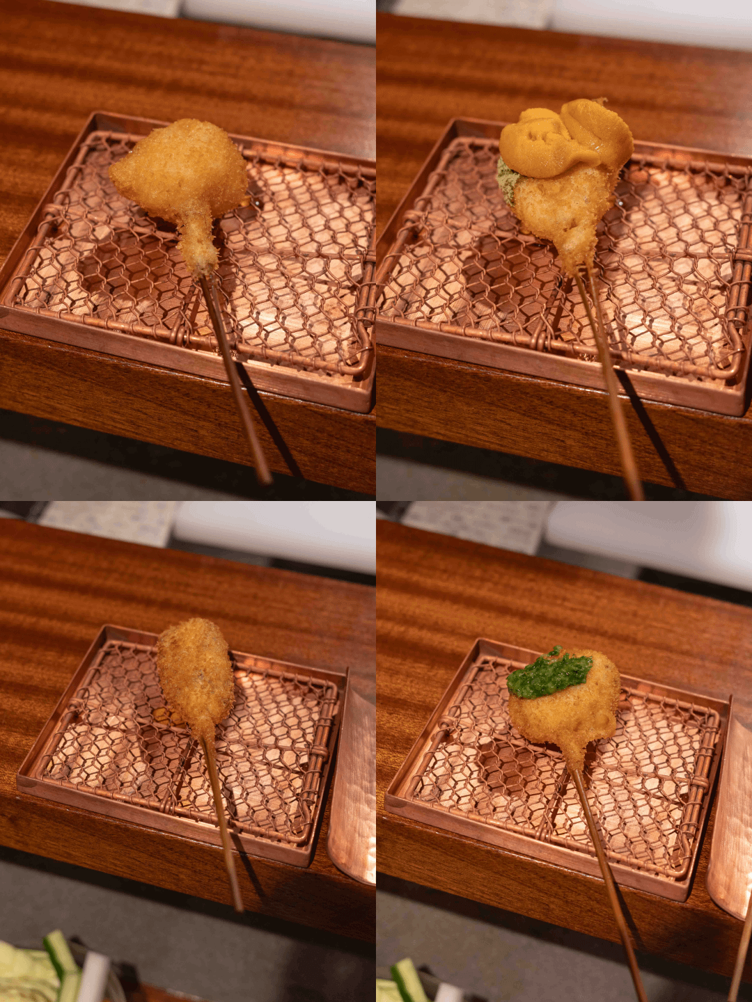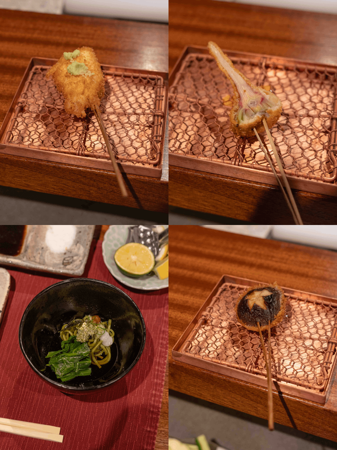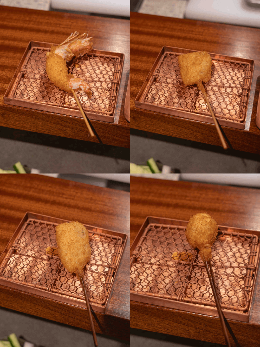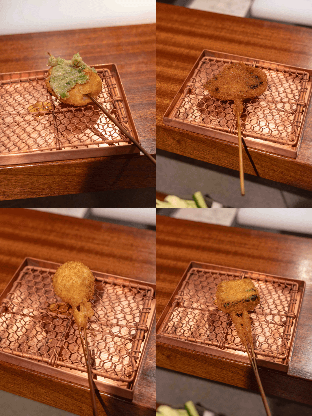 I know deep-fried food isn’t the most interesting thing to look at, but here are some photos of the skewers, ordered from top to bottom, left to right, with ☆ marking the skewers and dishes I particularly enjoyed: