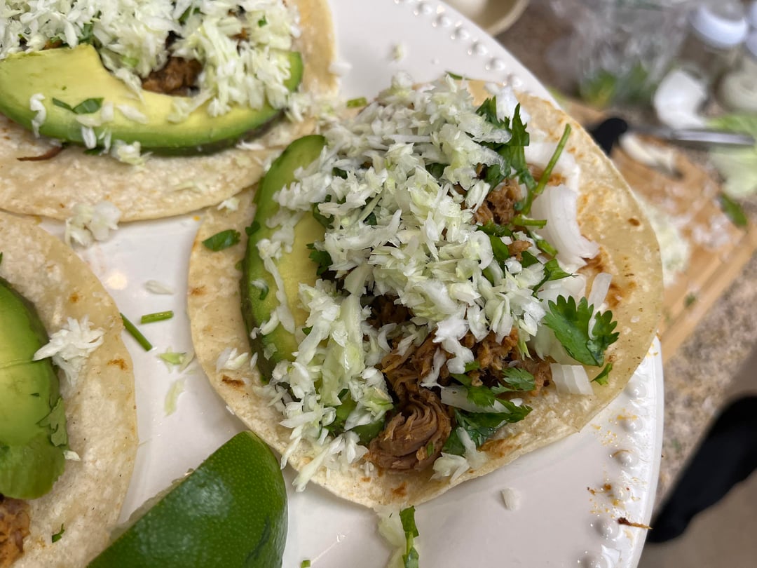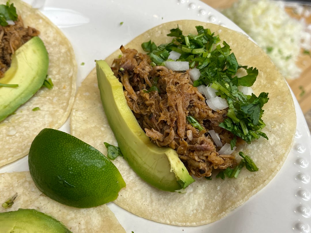 Notes: This recipe can be accomplished in several ways, but the key steps are those designed to retain and prevent liquid loss (e.g., brining and capturing lost liquid). Use of a sous vide immersion circulator for cooking is very helpful because it reduces liquid loss and lets you capture a lot of lost liquid easily. You can, of course, skip the sous vide and do the whole cook in the smoker–just make sure you have a pan that can collect any liquid that comes out and add maybe a little chicken broth if it isn't moist enough once you've added that liquid back in. Finally, I show the tacos with and without grated cabbage, so you can see the meat better, but I really recommend giving the cabbage a try.