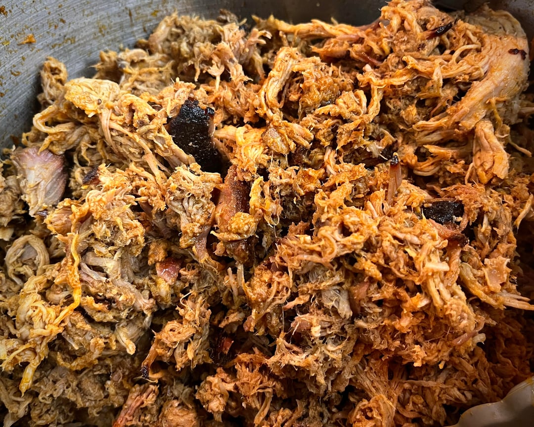 Smoke Meat: Remove meat from bag, making sure to retain all liquid and store liquid in the fridge until ready to use. Place meat on a wire rack on top of a grill pan with 2 cups of water in the pan. Smoke for 6hrs at 225°F. I recommend apple wood for its mild and sweet qualities that really complement the pork. Once smoked, bring meat inside. Reheat sous vide liquid in a pan along with the drippings from the grill pan. You may need to scrape them out if they've cooked down, but try not to introduce anything actually burnt. Place meat in large sturdy bowl and pull. I find that smashing with a wire potato masher is very effective. Slowly re-introduce cooking liquid to pulled pork, stirring as you go for even distribution.