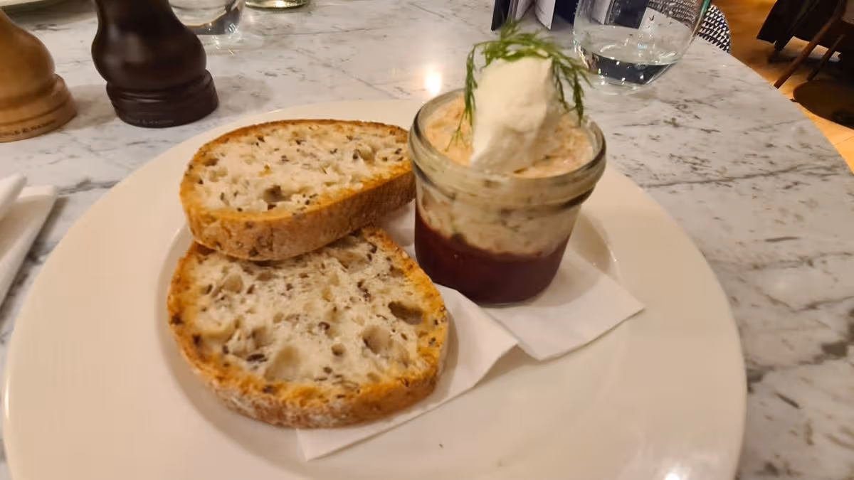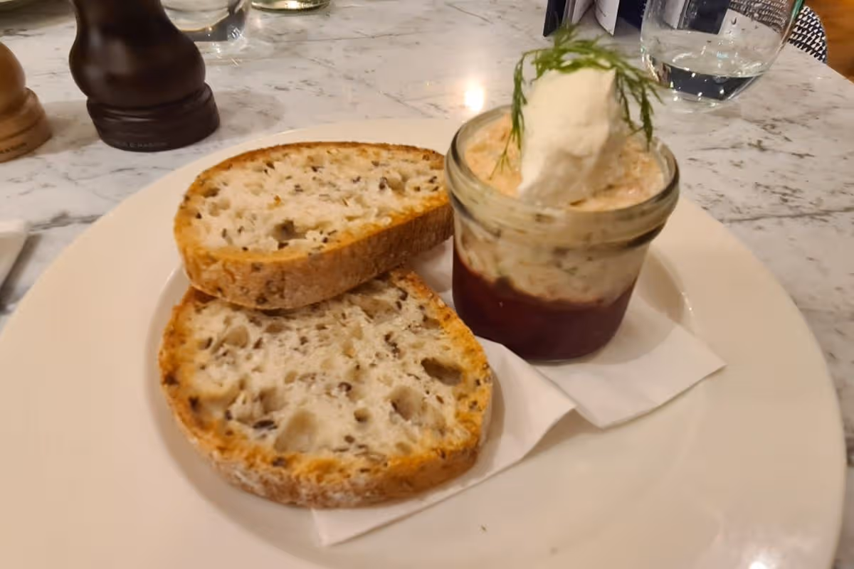 As a starter, I ordered the smoked salmon rillettes with beetroot and sourdough bread. Time for a confession: I did not know what a rillette was.
