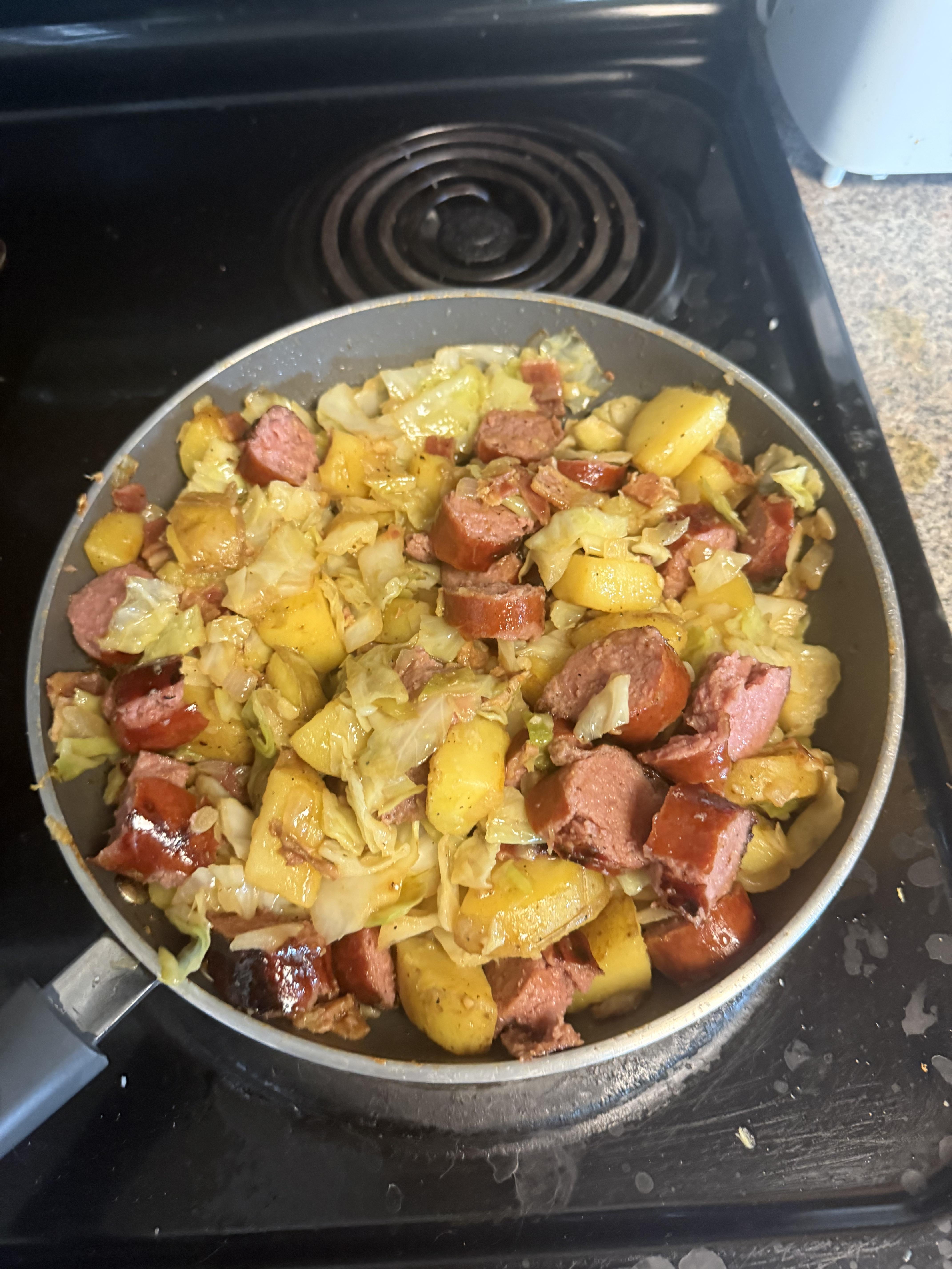 Share Facebook Twitter Pinterest LinkedIn Reddit Smoked sausage and bacon with cabbage, potatoes and onions. by Radiant_Trouble2606 4 Comments MyWorkIsNotYetDone 3 days ago I mean… that will soak up the booze. And taste good while it’s doing it. Proud_Doubt5110 3 days ago Some large eggshell pasta would be pretty good too FatMoDean 3 days ago Whatever that is, there’s probably a Polish name for it. Add some paprika, peppers and pasta and there’s probably a Hungarian name for that. Ulti 3 days ago Oh hell yeah the “everything I have in the fridge” play! Love to see it.