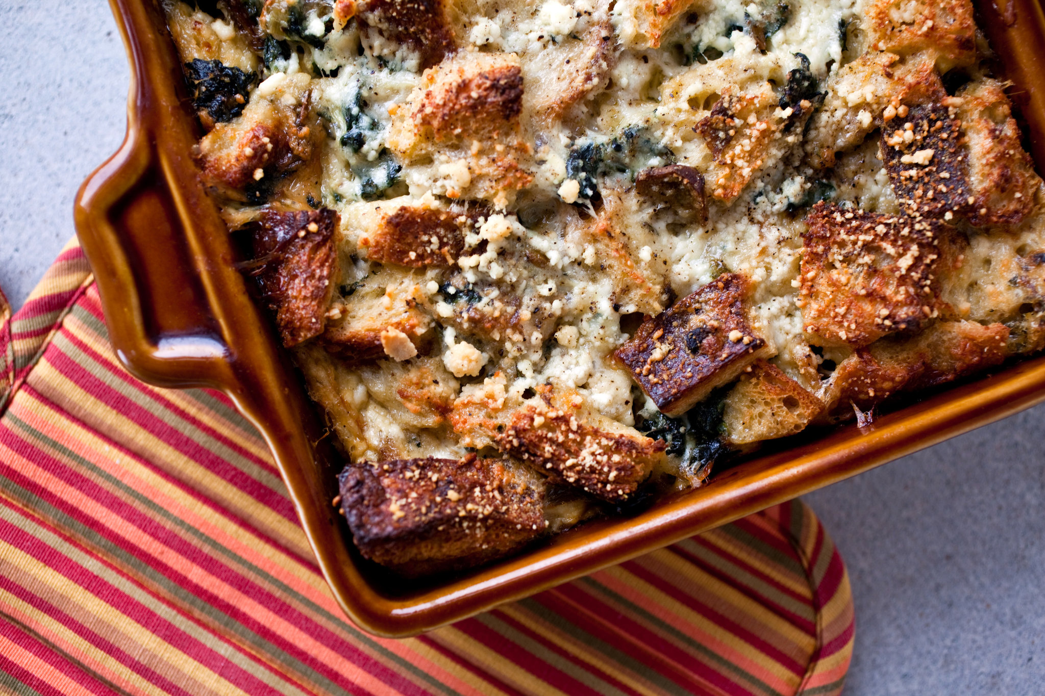 - Add 1 tablespoon of the olive oil to the pan, turn the heat down to medium and add the minced garlic. Cook, stirring, until fragrant, about 30 seconds, and stir in the reconstituted mushrooms, the rosemary and the chard. Stir together for a couple of minutes, and season to taste with salt and pepper. Remove from the heat, and transfer to the bowl with the bread cubes. Add the cheeses, and toss together. Arrange in the baking dish.