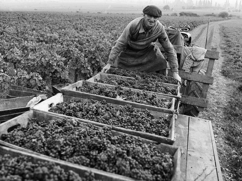 A farmer in Savigny-lès-Beaune, Burgundy, harvesting wine grapes in 1965. (Louis Falquet/Wikimedia Commons via Courthouse News)