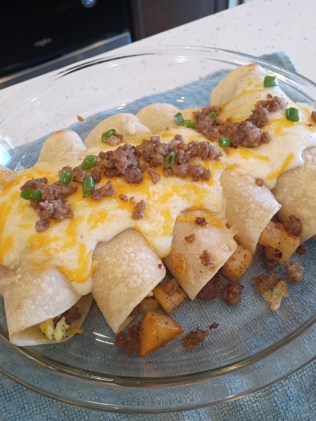 I’d eat it but I’d do tiny diced potatoes, eggs, cheese, and chorizo inside with cheese and scallion on top.