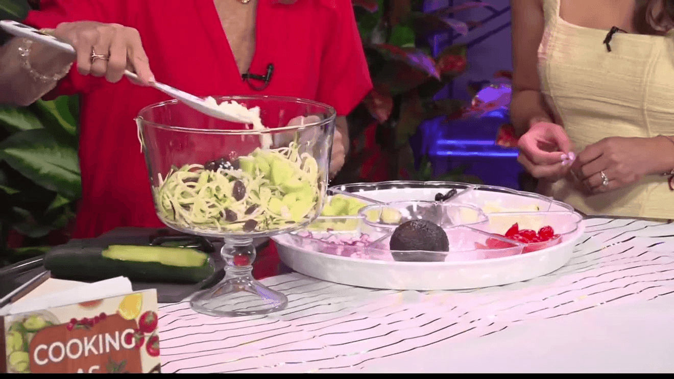 During her visit, she prepared what she calls a “Spring into Serenity Salad,” made with ingredients like spiralized zucchini noodles, cucumber, tomatoes, olives, avocado, red onion, and a simple olive oil and lemon dressing.