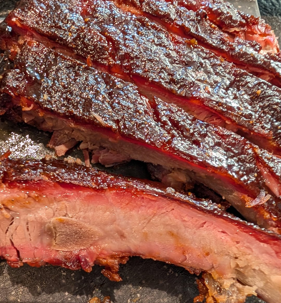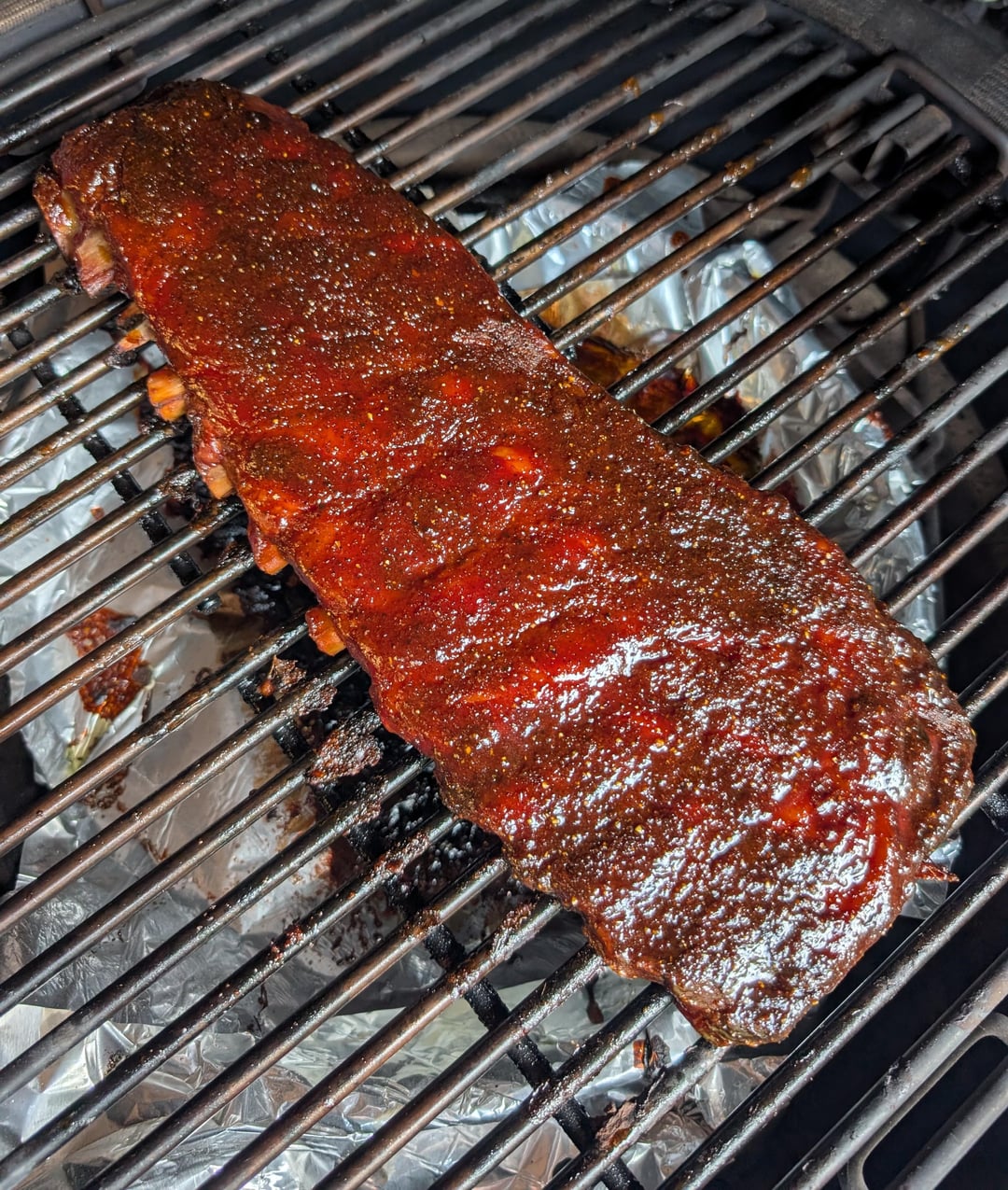 St. Louis spareribs with a honey musterd rub. 4 hours unwrapped, 1.5 hour wrapped with some butter and honey and 30 min unwrapped with homemade bbq sauce to finish it off. Tender, tasty and still enough bite to.