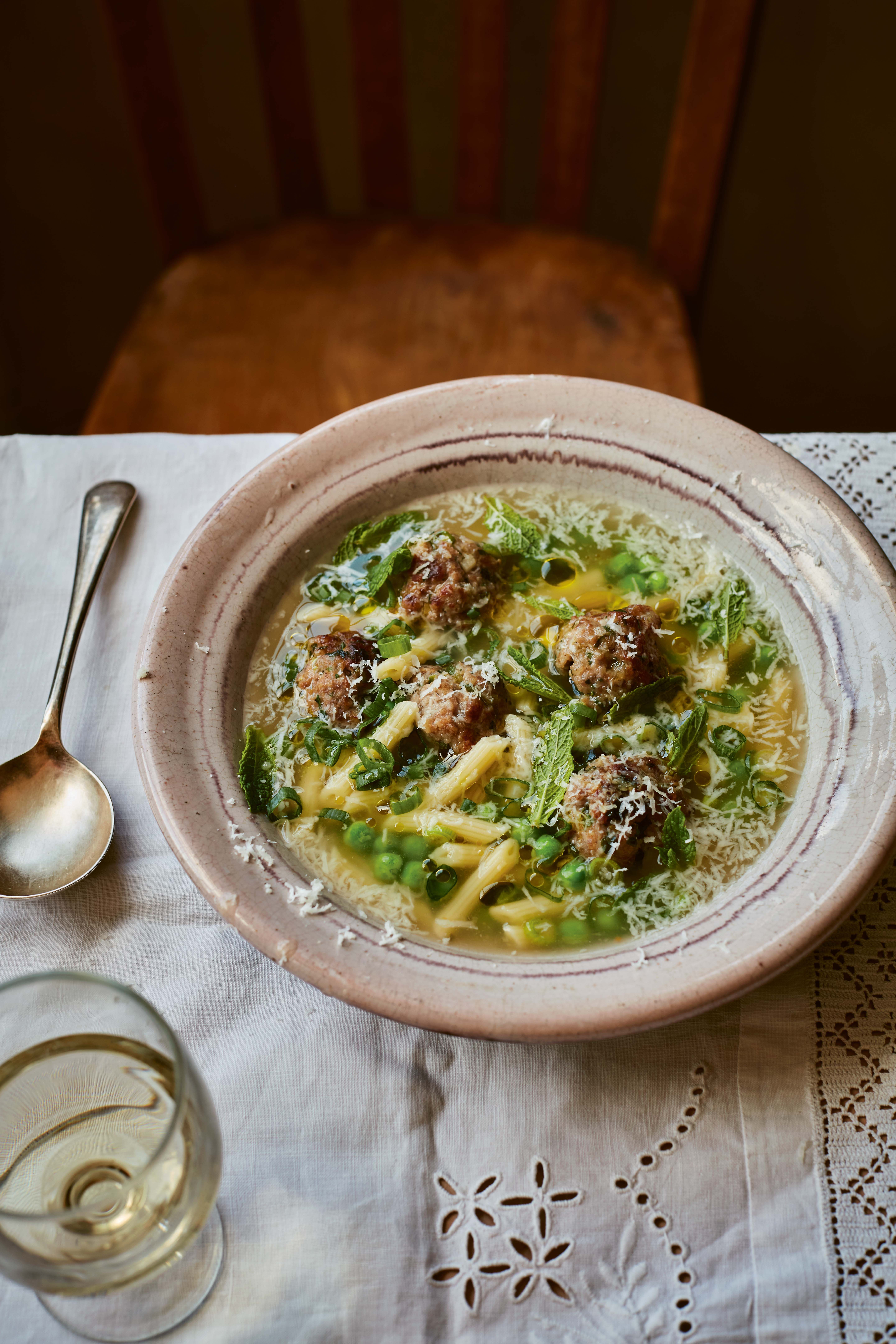 When the meatballs are browned and gnarly, pour the stock into the pan, bring to the boil and stir in the pasta and peas. Return to the boil, then simmer for 5-7 mins, or until the pasta is tender. Remove from the heat and squeeze in the lemon juice. Taste the broth and adjust the seasoning as needed.