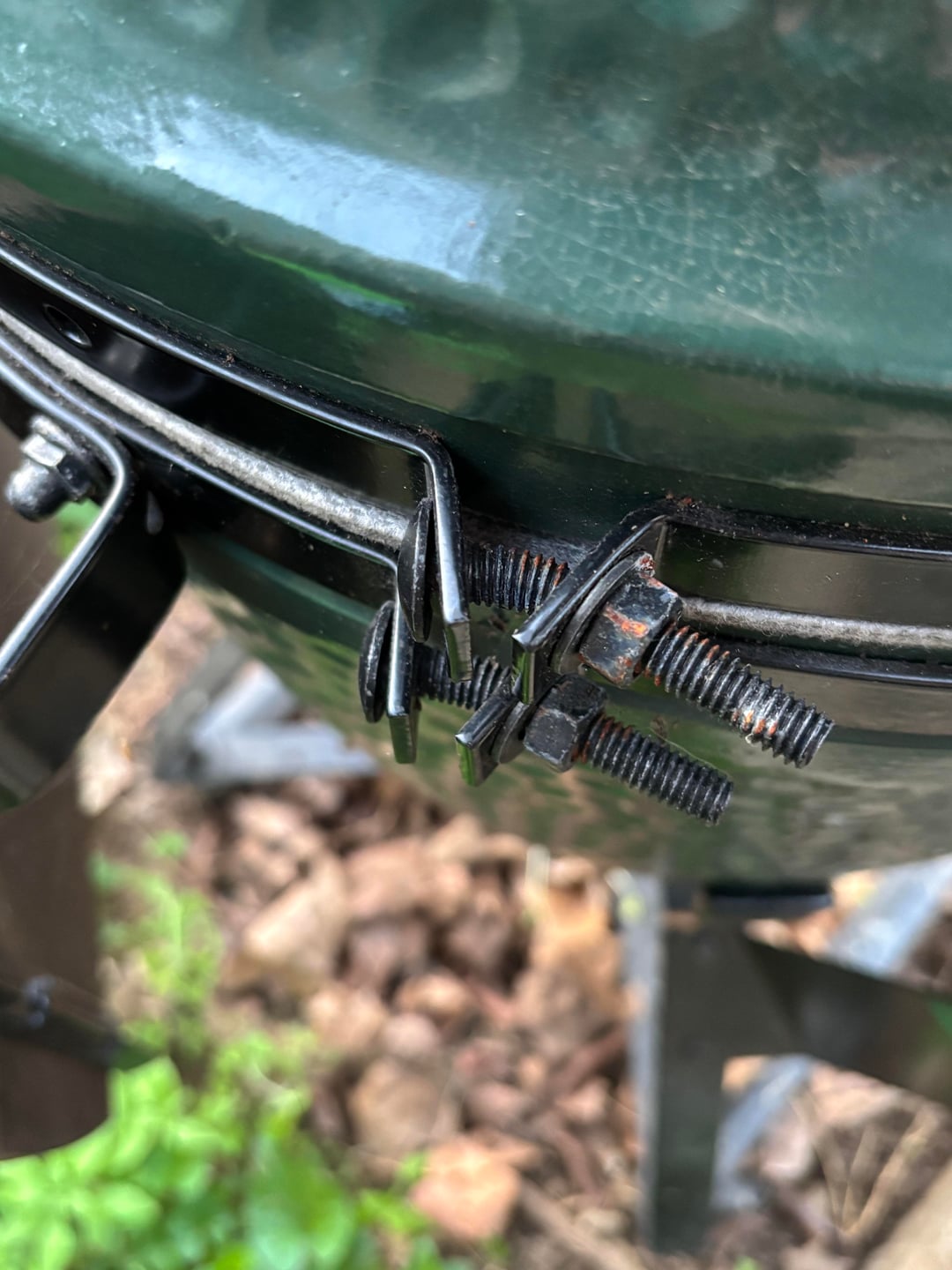 And the hinge assembly looks bent. Maybe they bent it somehow while open (no idea how) and then removed bolts to get it closed again? You may be able to unbend the affected parts, but I would remove from the egg before attempting this. But I would probably just figure our what size this is then order the Band Assembly Kit for this size (e.g. for the Large Egg: [https://biggreenegg.com/products/large-band-assembly-kit](https://biggreenegg.com/products/large-band-assembly-kit) )