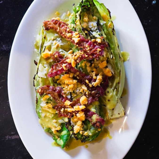 It’s the perfect dressing for a charred cos lettuce and pancetta salad. The grilled cos lettuce adds a charcoal flavour, while crispy pancetta and a sprinkle of parmesan add the perfect finishing touch.