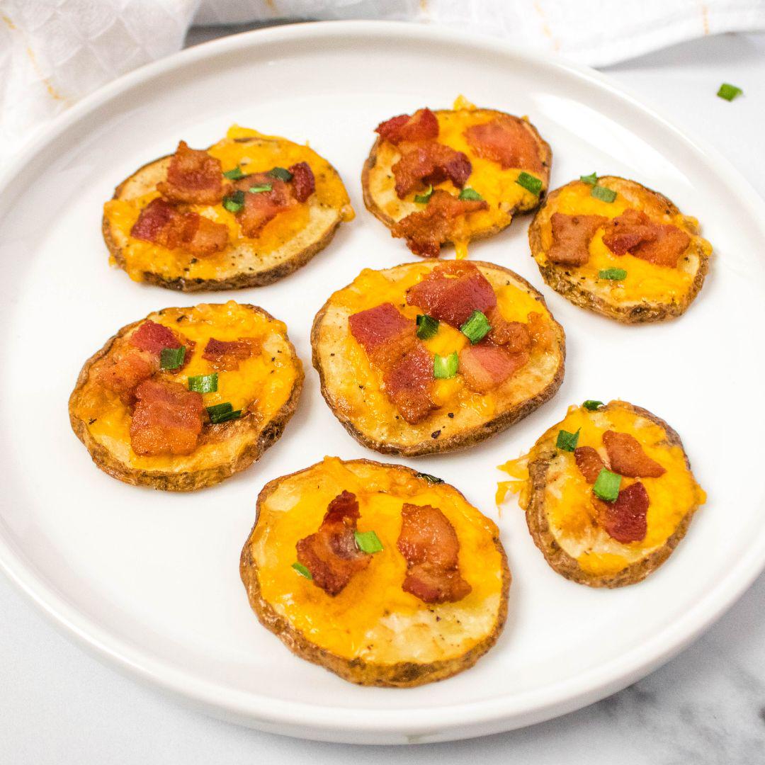 I made these as a side dish and they ended up being the main event. Crispy potato slices topped with bacon and melted cheese out of the air fryer. I had to stop myself from eating the whole tray.