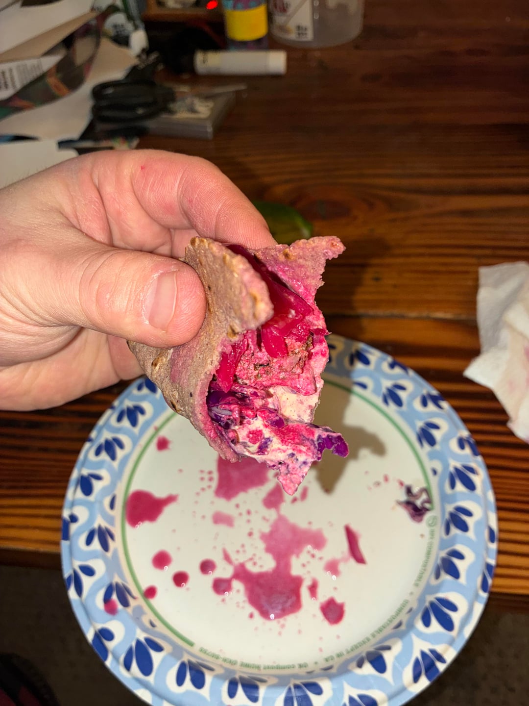 Details: fried scallops, panko dusted with chipotle powder on a bed of organic red cabbage, red corn tortillas made with Masienda red corn masa harina. Pickled red onions died with beet juice, chipotle crema sauce, and a beet habanero salsa. Overall – I’m pleased with the results. I do have cilantro to put on it. But I was hungry lol