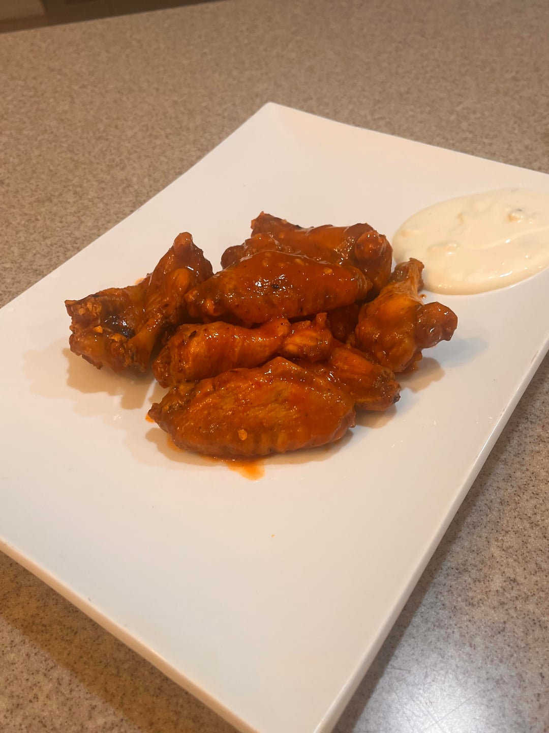 Air fried…franks red hot, Texas Pete, Carlos’ ghost pepper sauce, butter, chopped garlic, black pepper, salt, red pepper powder, crushed red pepper, onion, cayenne, a pinch of Tony chachere’s and a squeeze of lemon juice.