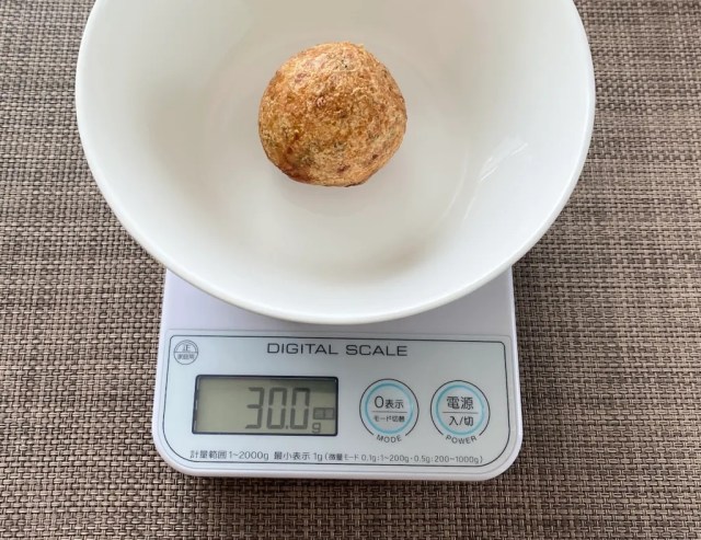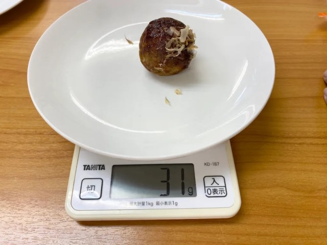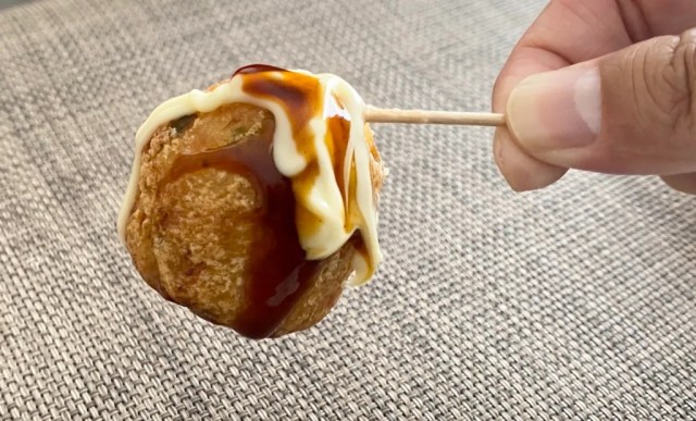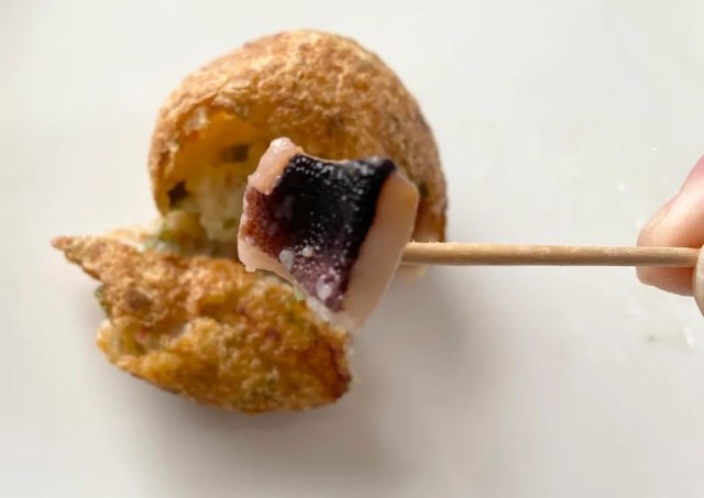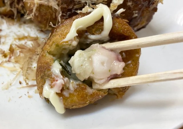 Before starting our taste test, we wanted to know exactly what we were working with here. Separating one dumpling from its brethren, we weighed it with our kitchen scale and found it to weigh 30 grams (1.1 ounce), about 50 percent more than an average takoyaki. Of course, that could just mean a lot of extra batter was used to hide a miniscule amount of octopus, so next we used a knife to slice the dumpling open, and waiting inside was a reassuringly large chunk of seafood.