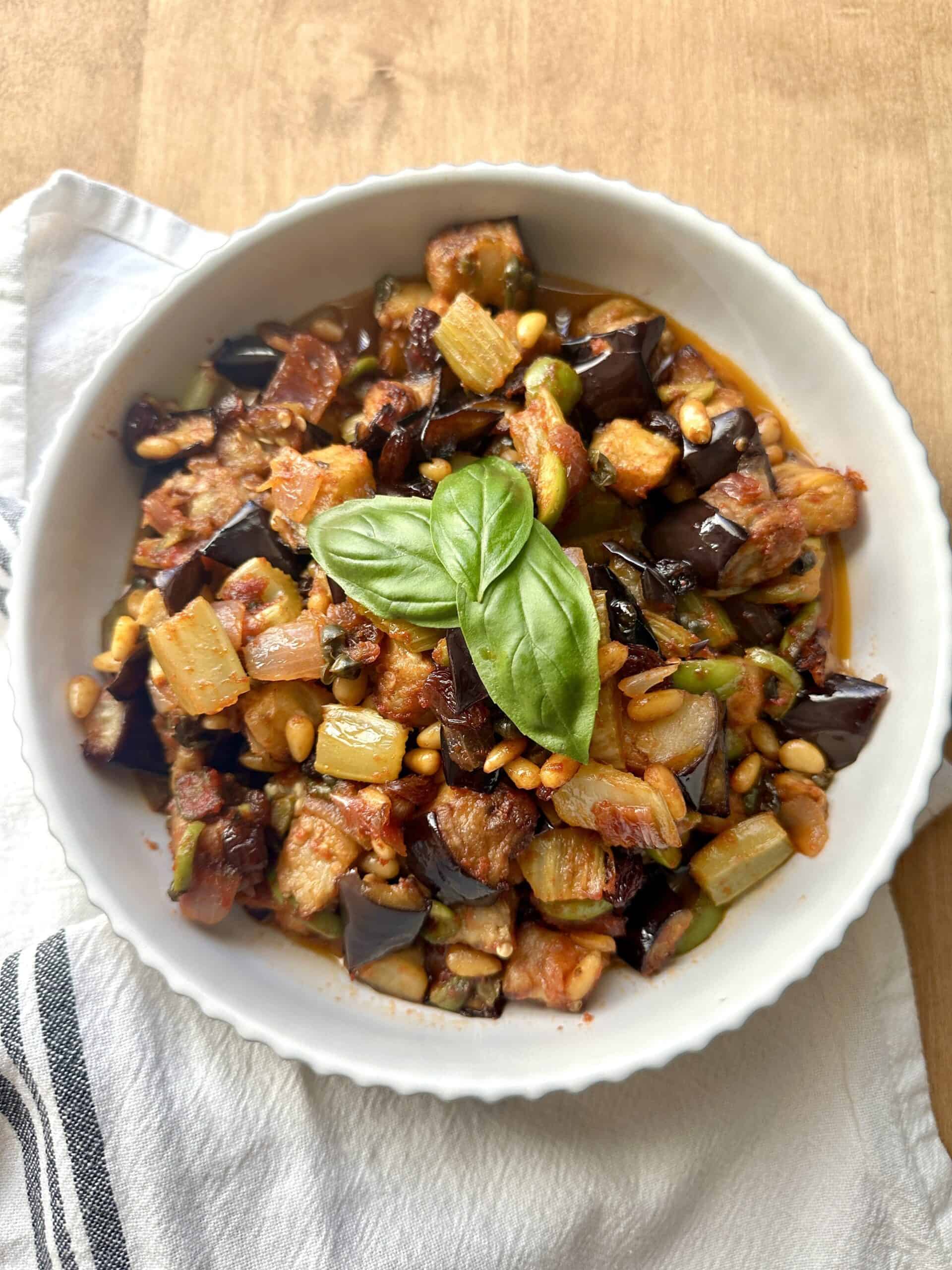 Close-up of a bowl of authentic Sicilian eggplant caponata, featuring diced eggplant, celery, tomatoes, green olives, and pine nuts in a rich tomato-based sauce, garnished with fresh basil leaves, served in a white dish on a wooden table with a striped cloth.