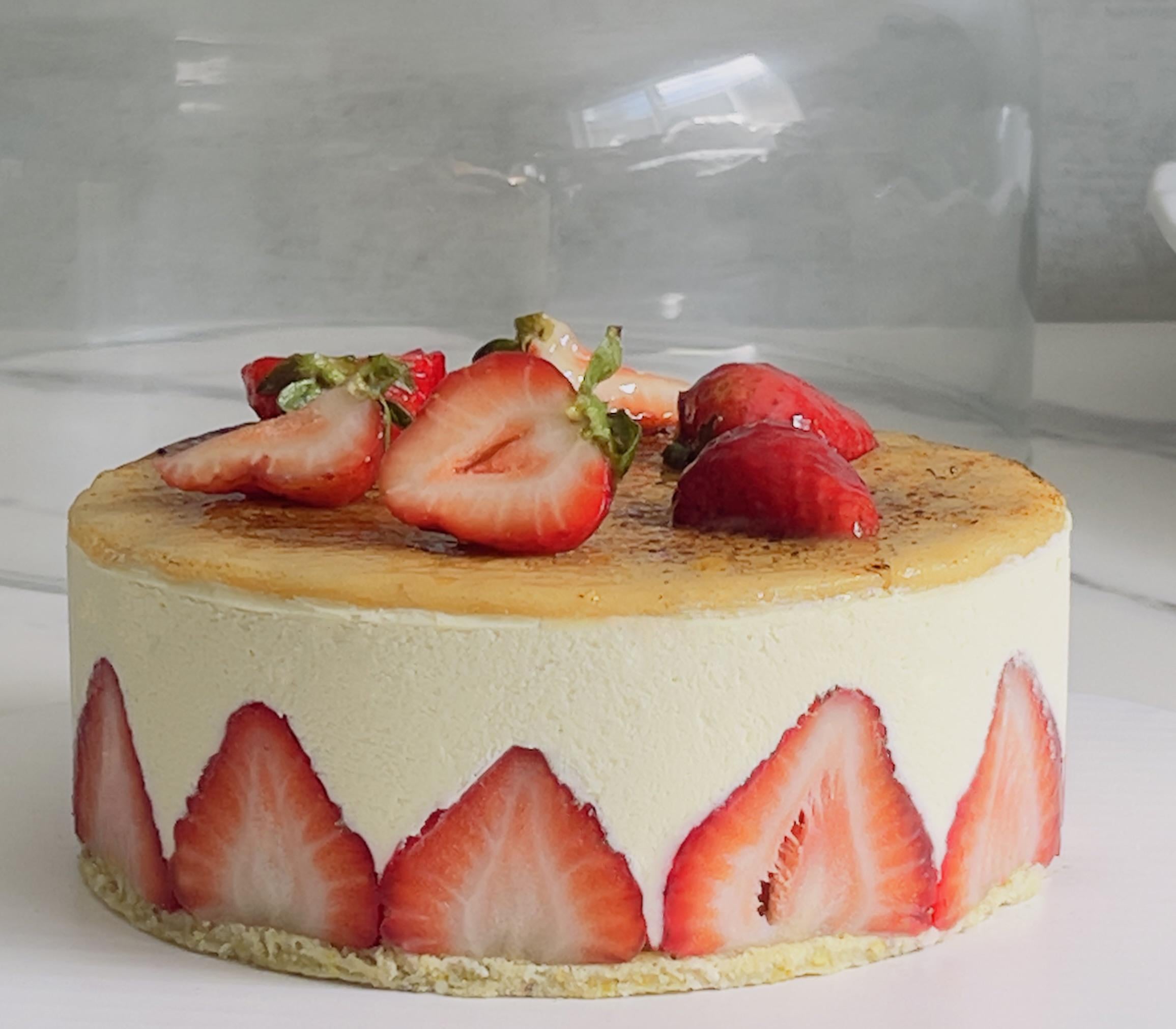 Made a pistachio fraisier with a pistachio almond joconde, strawberry chambord lime compote with fresh strawberries, pistachio mousseline and a burnished marizipan topper. Glazed some strawberries 🍓 with an apricot glaze.