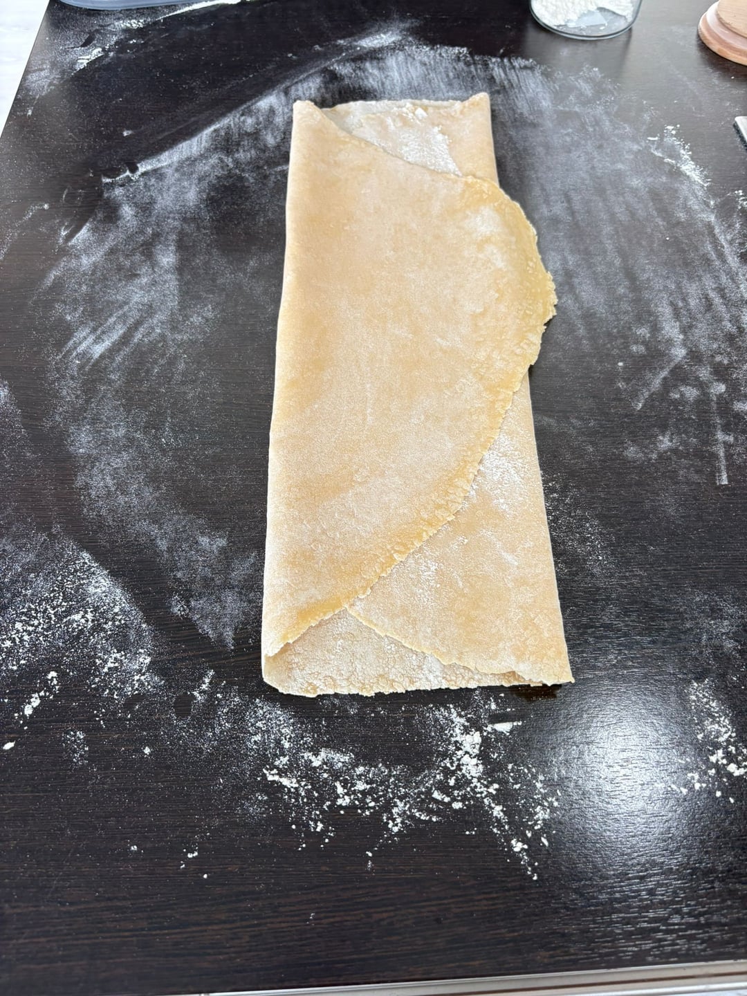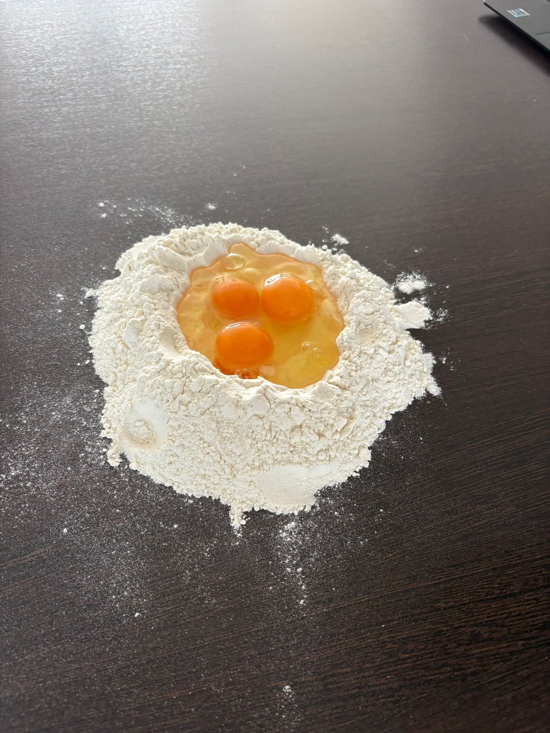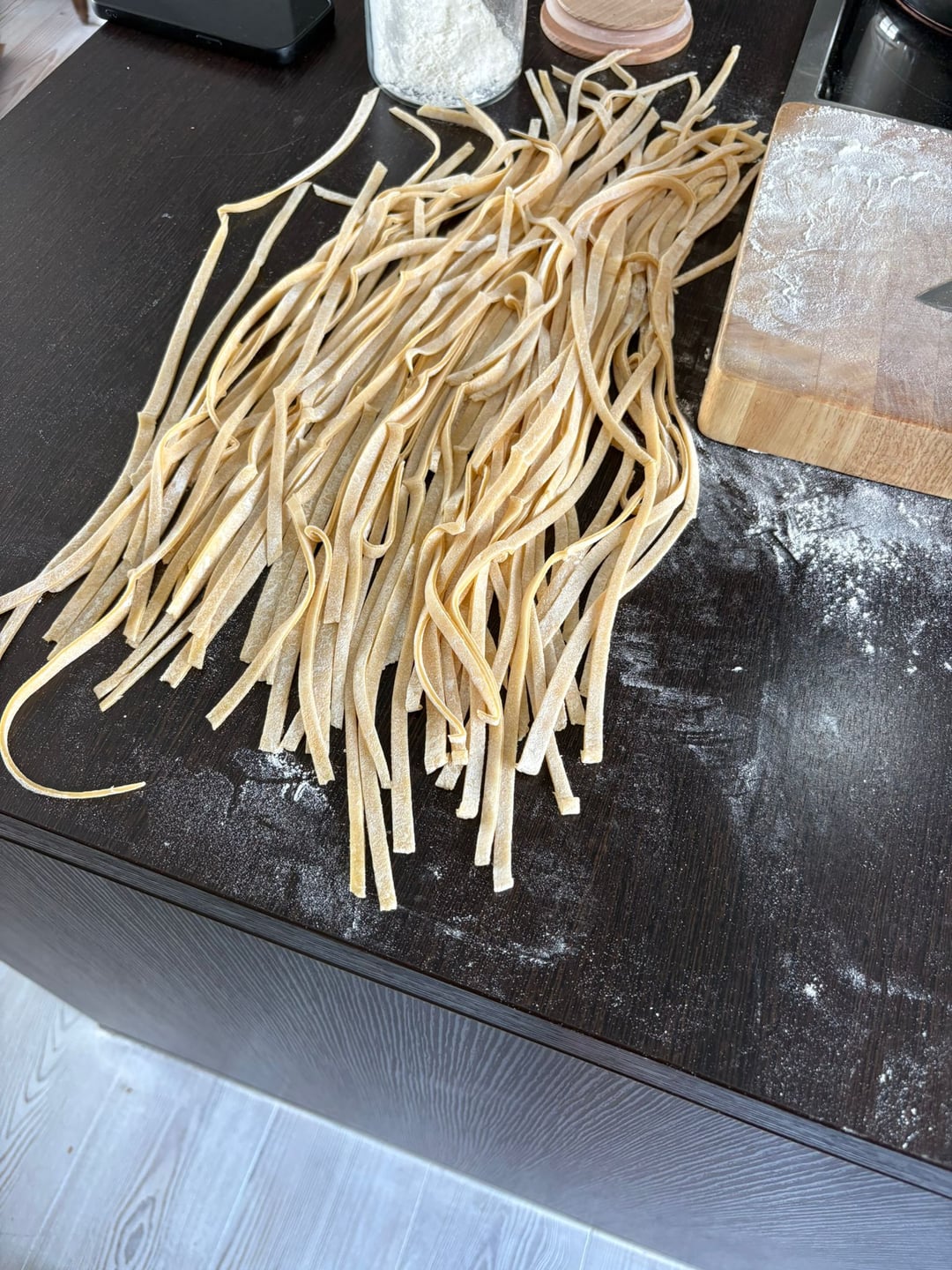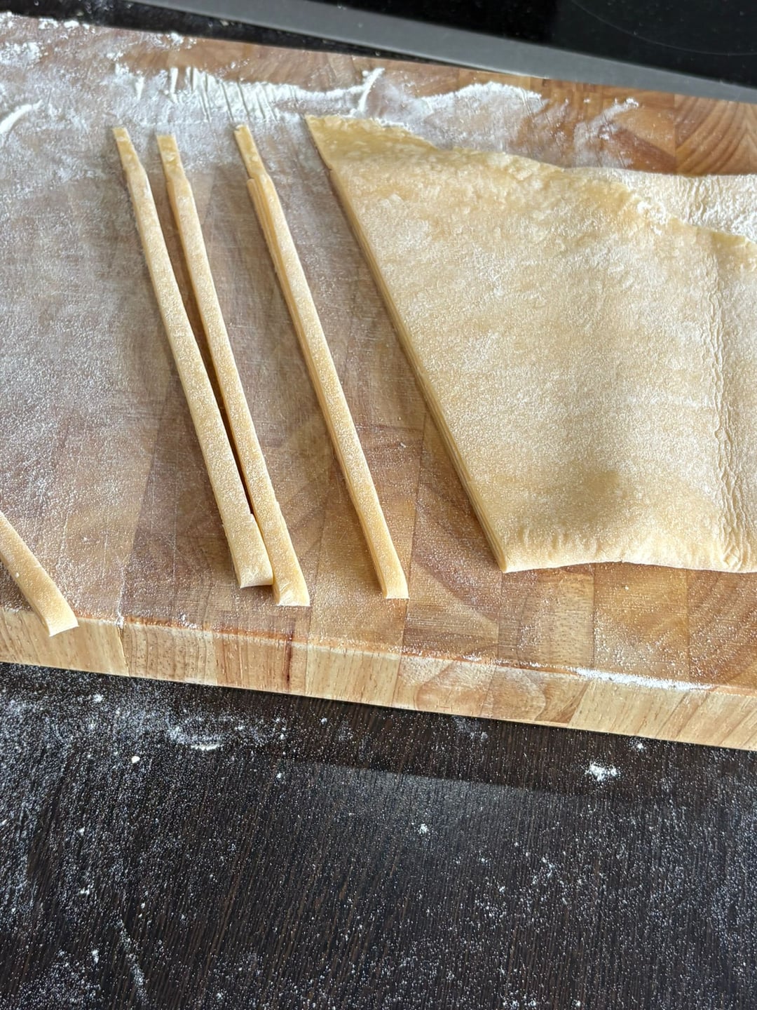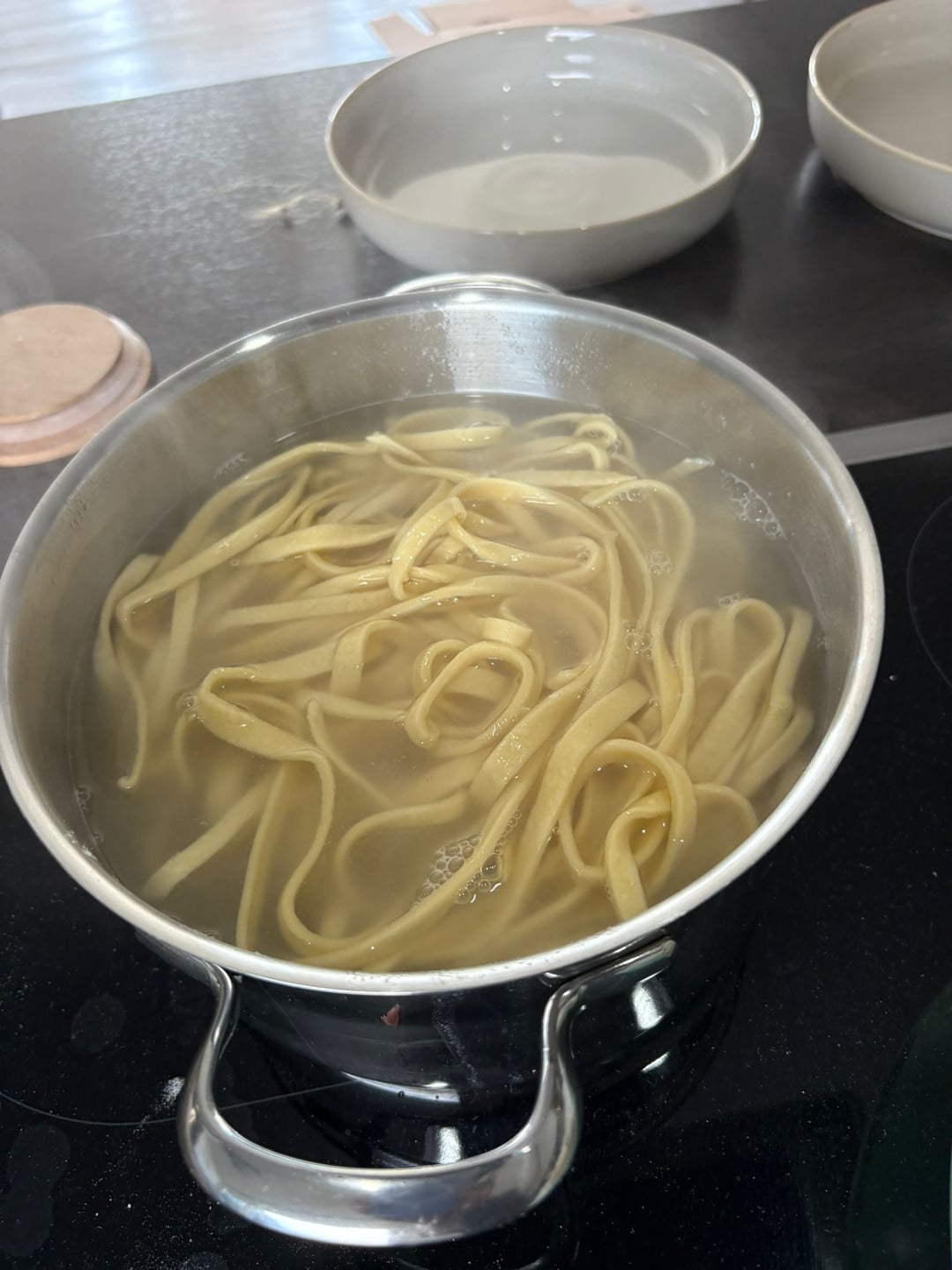 Make a flour volcano by making a well with the flour on a clean counter and cracking the eggs into it. Break the eggs down with a fork and start folding the flour into the eggs until no more liquid egg is visable. Knead with your hands for 10 minutes, the goal is a round ball like in the picture. If it is too sticky add more flour and keep kneading. When your finished cover the ball with a clean cloth and let rest for 45 minutes. After rest should dust your work surface with flower and start rolling out the dough as flat as you possibly can. Really and i cant stress this enough put your back into it. After it's rolled out flat you dust it again and fold it like you see in the picture, now cut your desired noodle thickness and untangle them. These noodles need 3 minutes too boil. Give the water more salt than you normally would, because these soak up less water than dried pasta. Save one cup of the starchy noodle water.