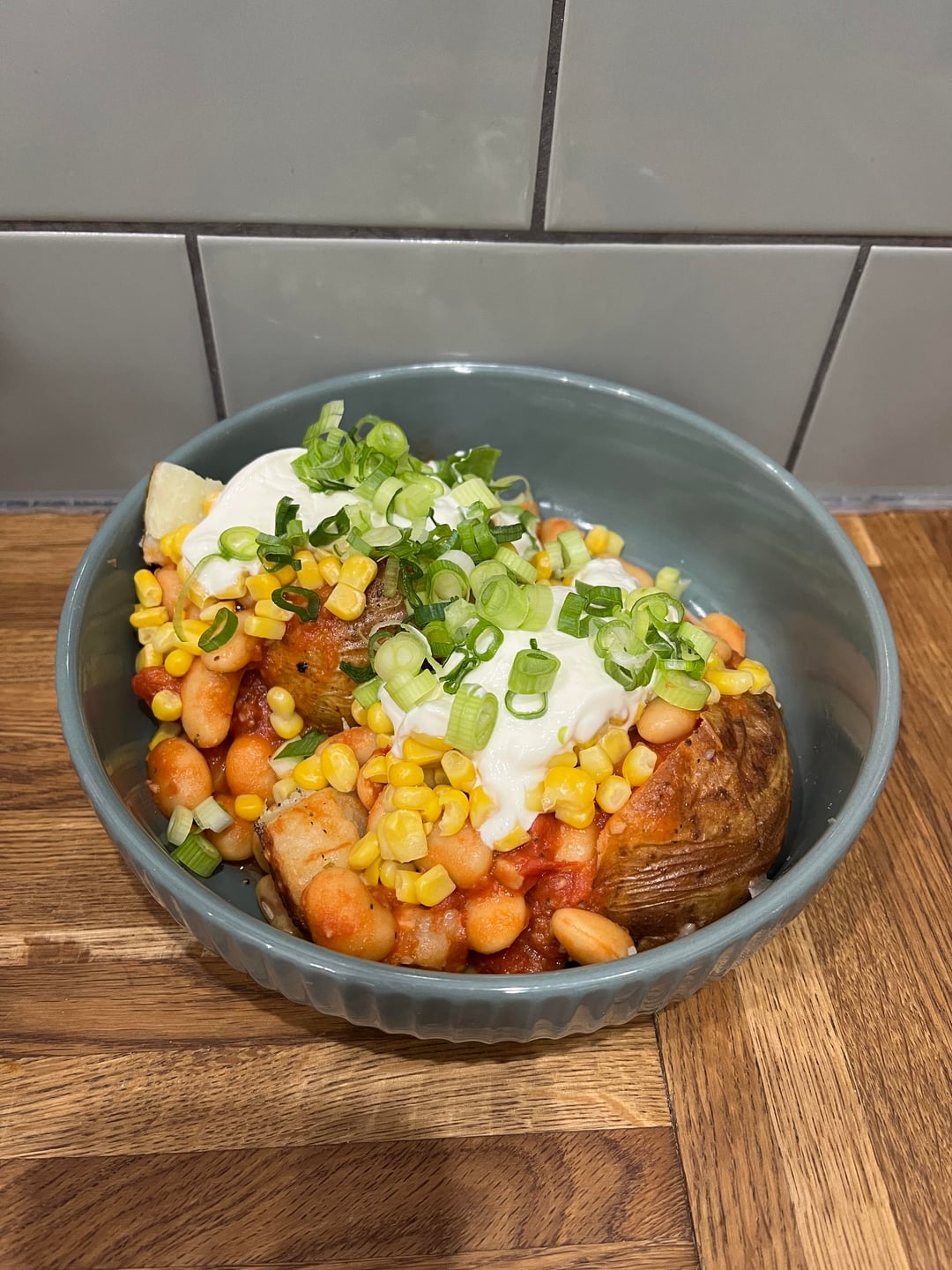 * loaded jacket potatoes with butter, cheese, homemade beans, sweetcorn, soured cream, green onions