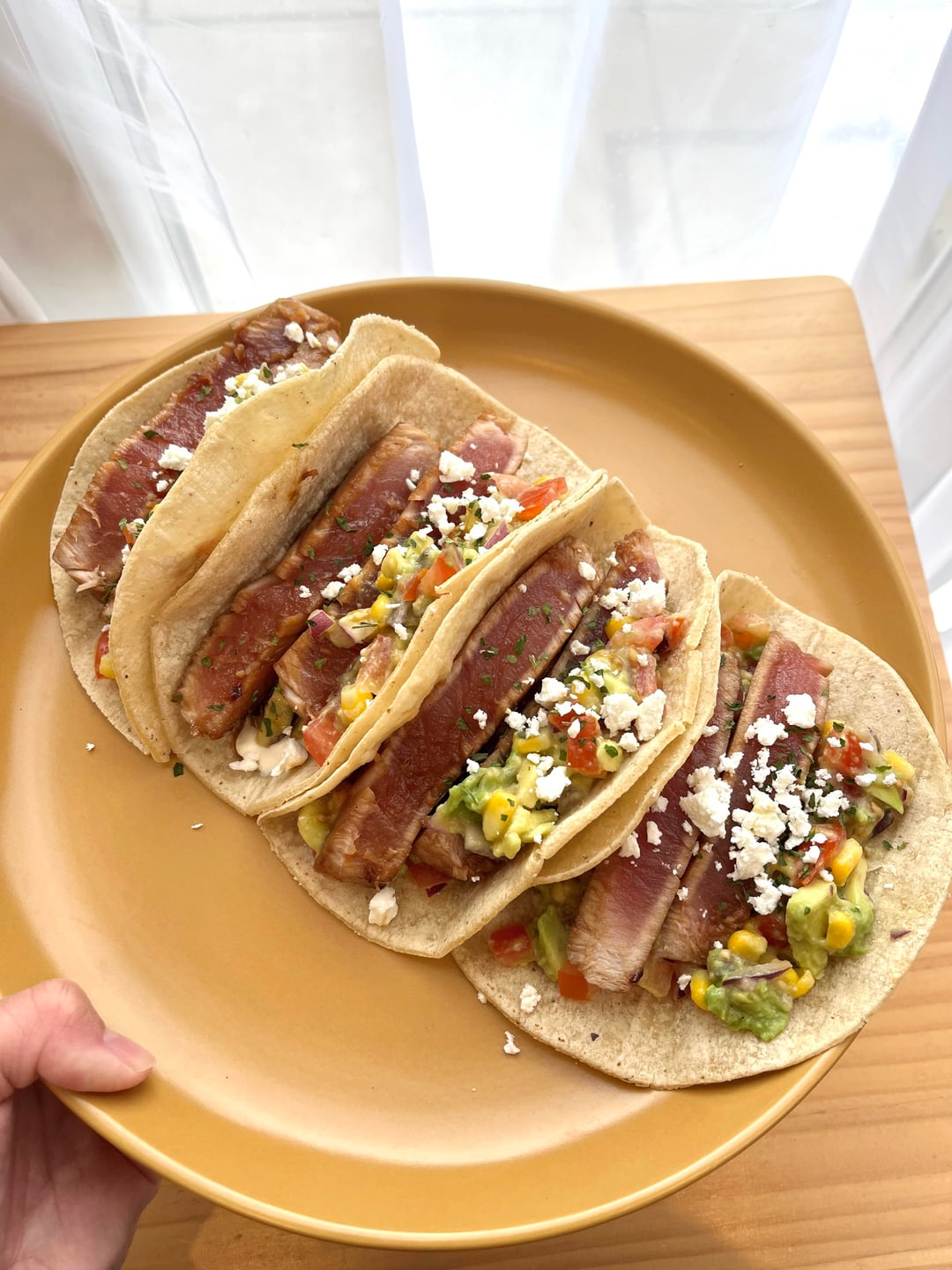 * tuna steak seared tacos with soured cream, sweetcorn avocado salsa, feta