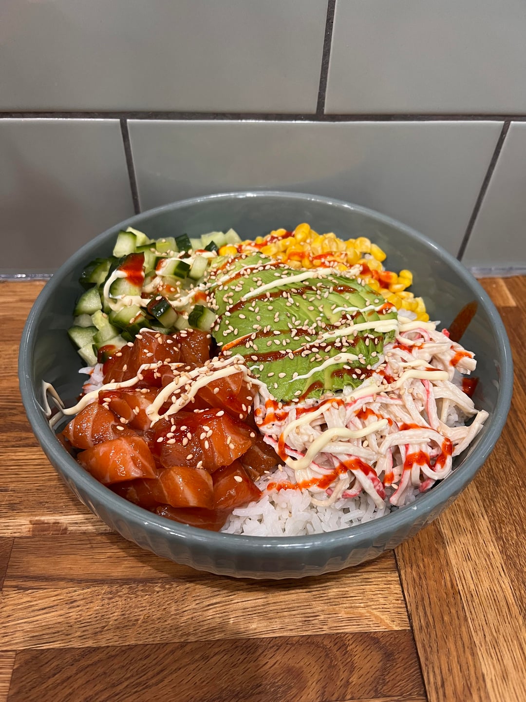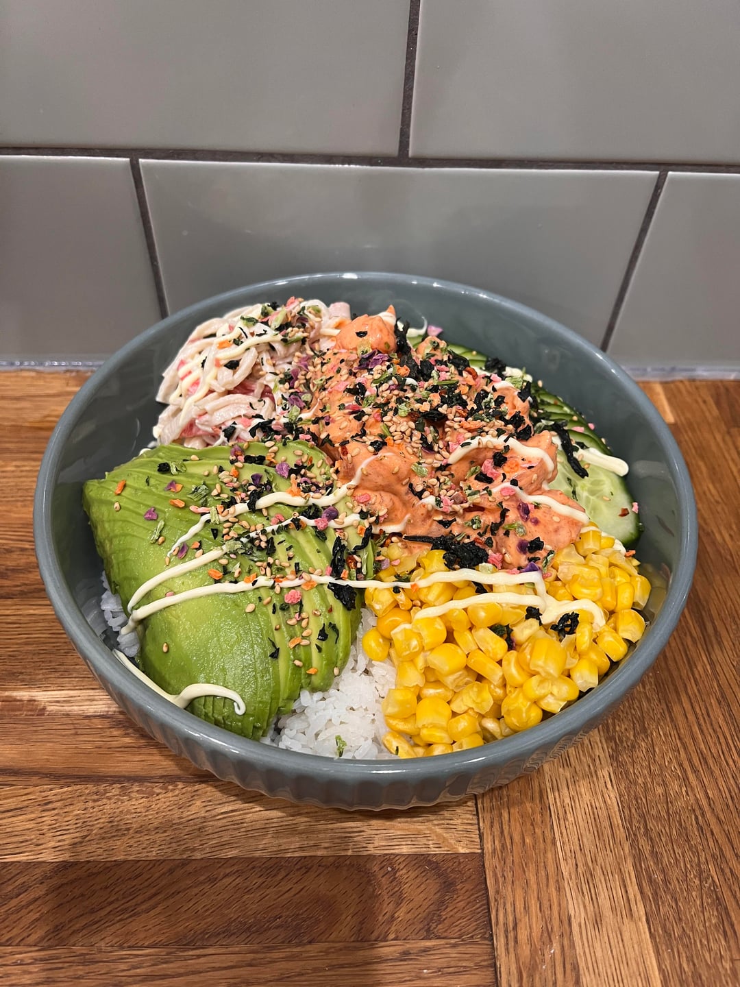 * shoyu + spicy mayo salmon poke with avocado, imitation crab, cucumber, sweetcorn, kewpie mayo and furikake