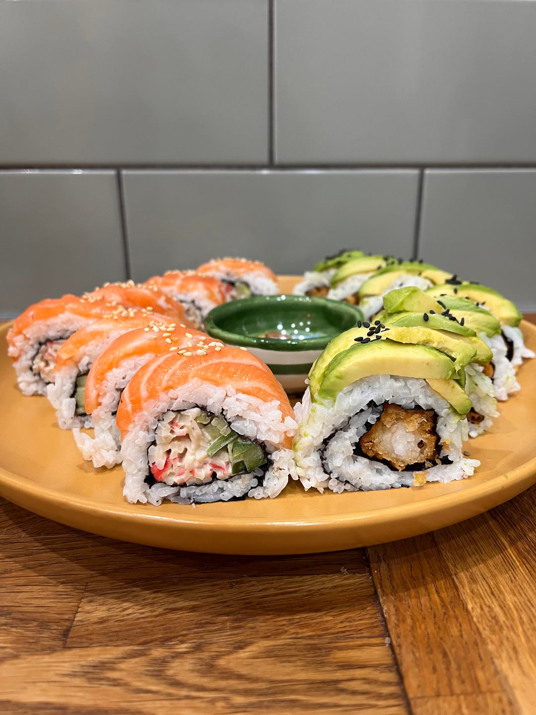 * salmon roll with imitation crab, cucumber and avocado roll with shrimp tempura
