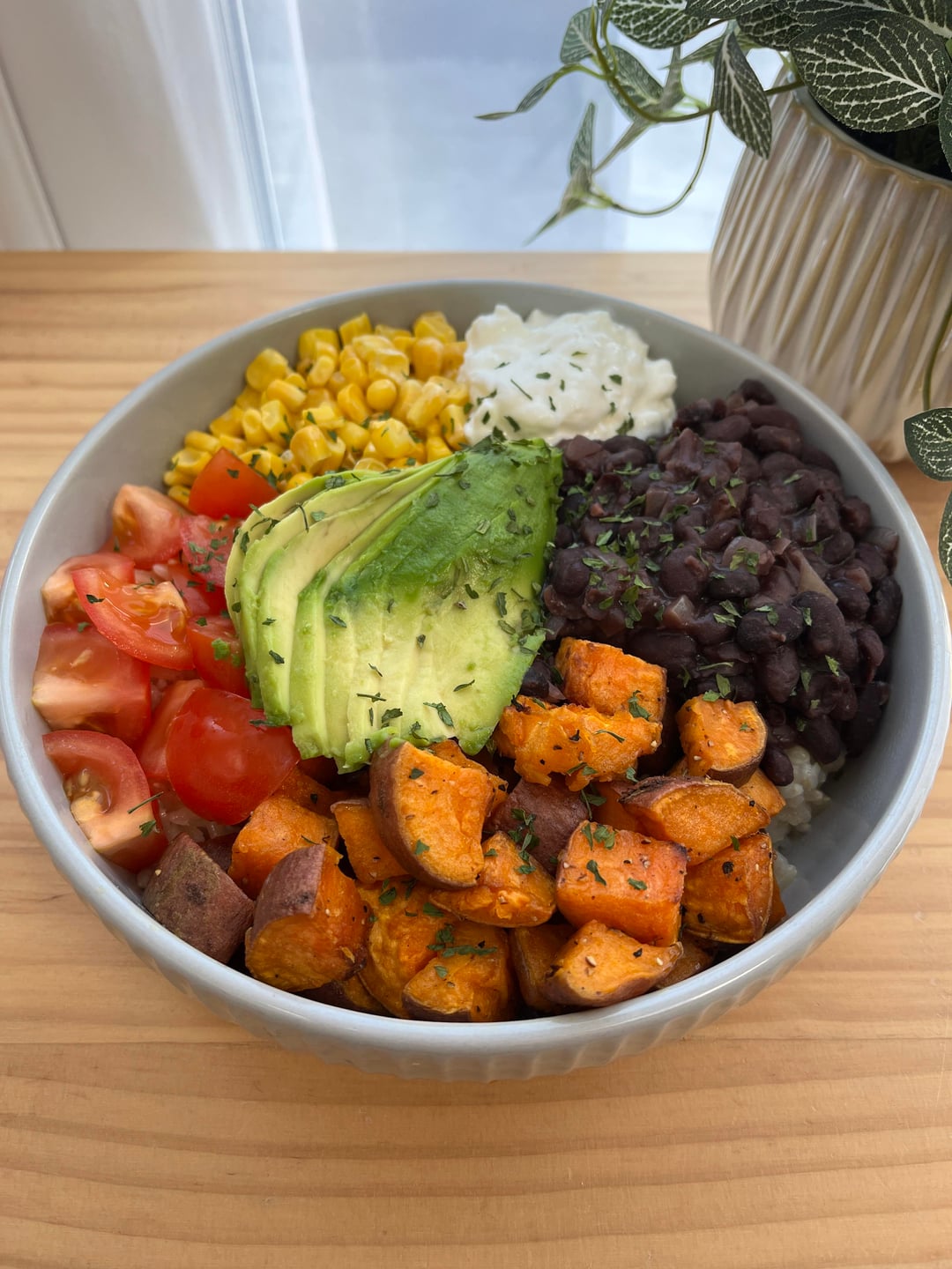 * sweet potato burrito bowl with brown rice, black beans, sweetcorn, tomato, avocado, and cottage cheese