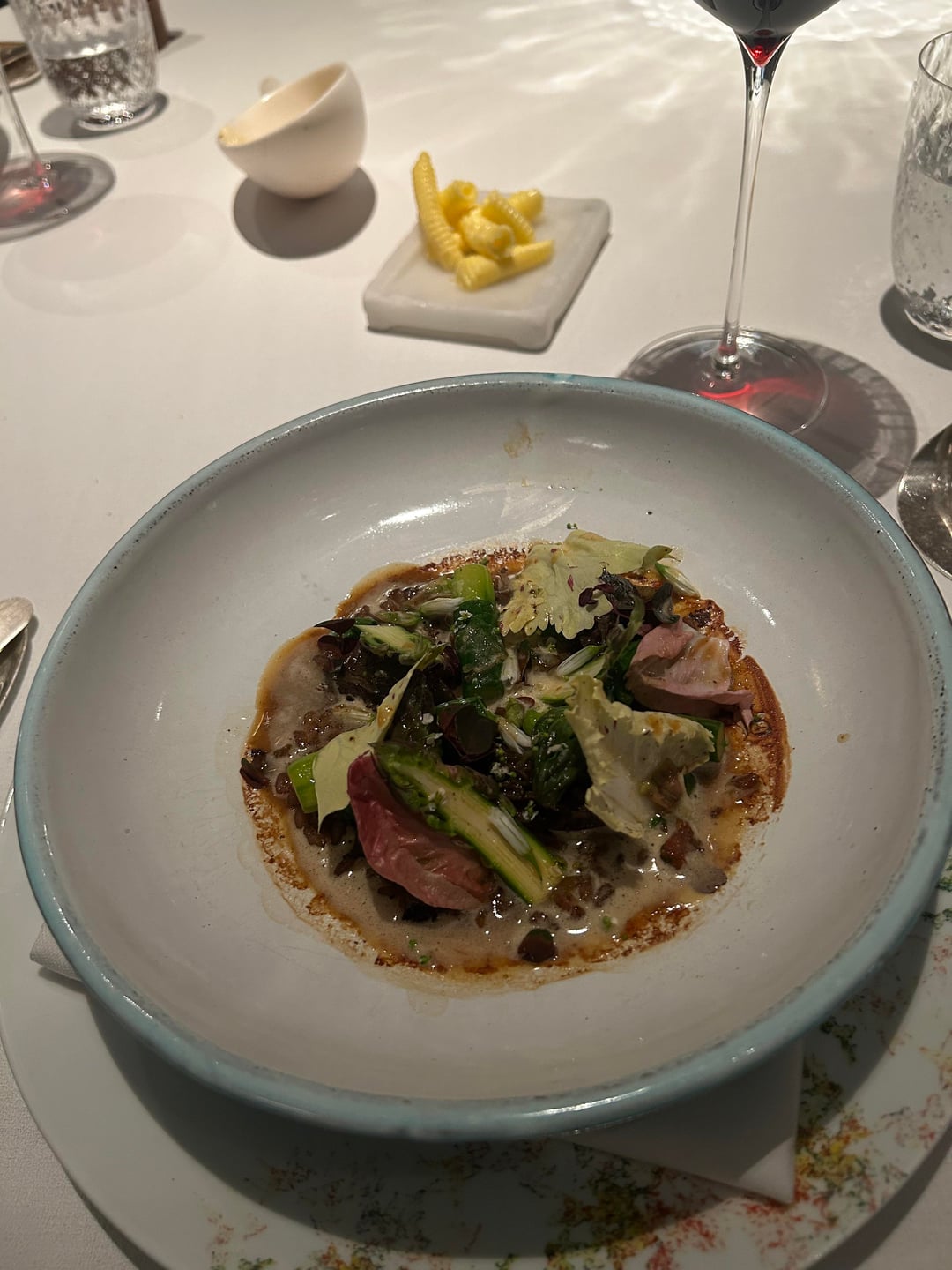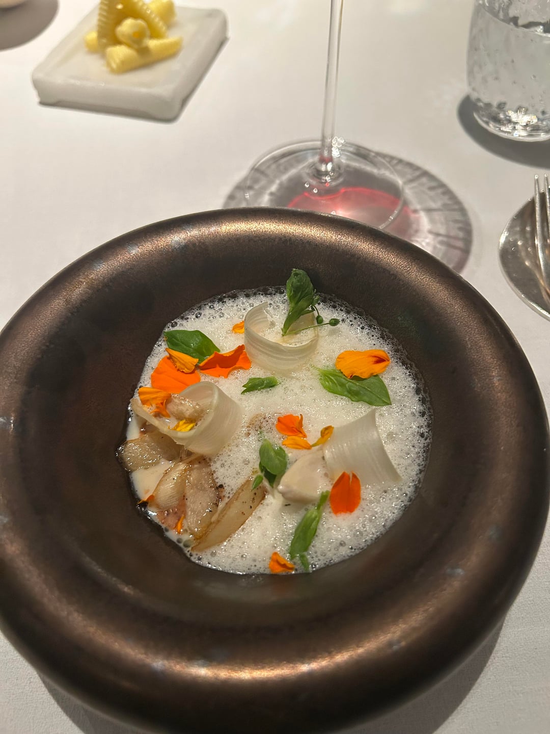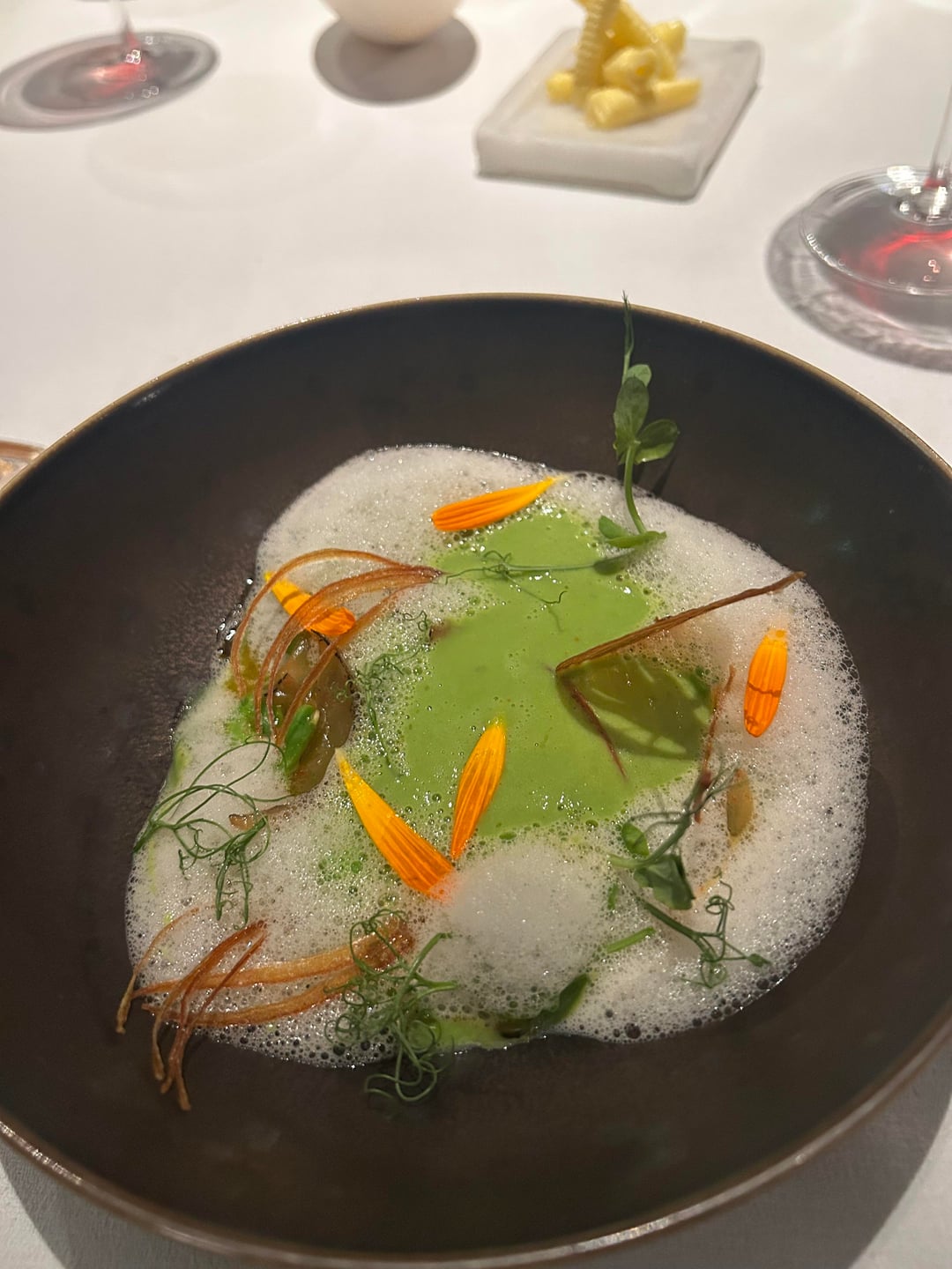 First proper course was white asparagus with almond, and that was probably my favourite of the night. The combination worked beautifully, and the foam tied everything together in a really delicate way. Then came a garden pea velouté with onions, which was also excellent. There was a really nice contrast between the slight crunch of the peas and the smoothness of the velouté.