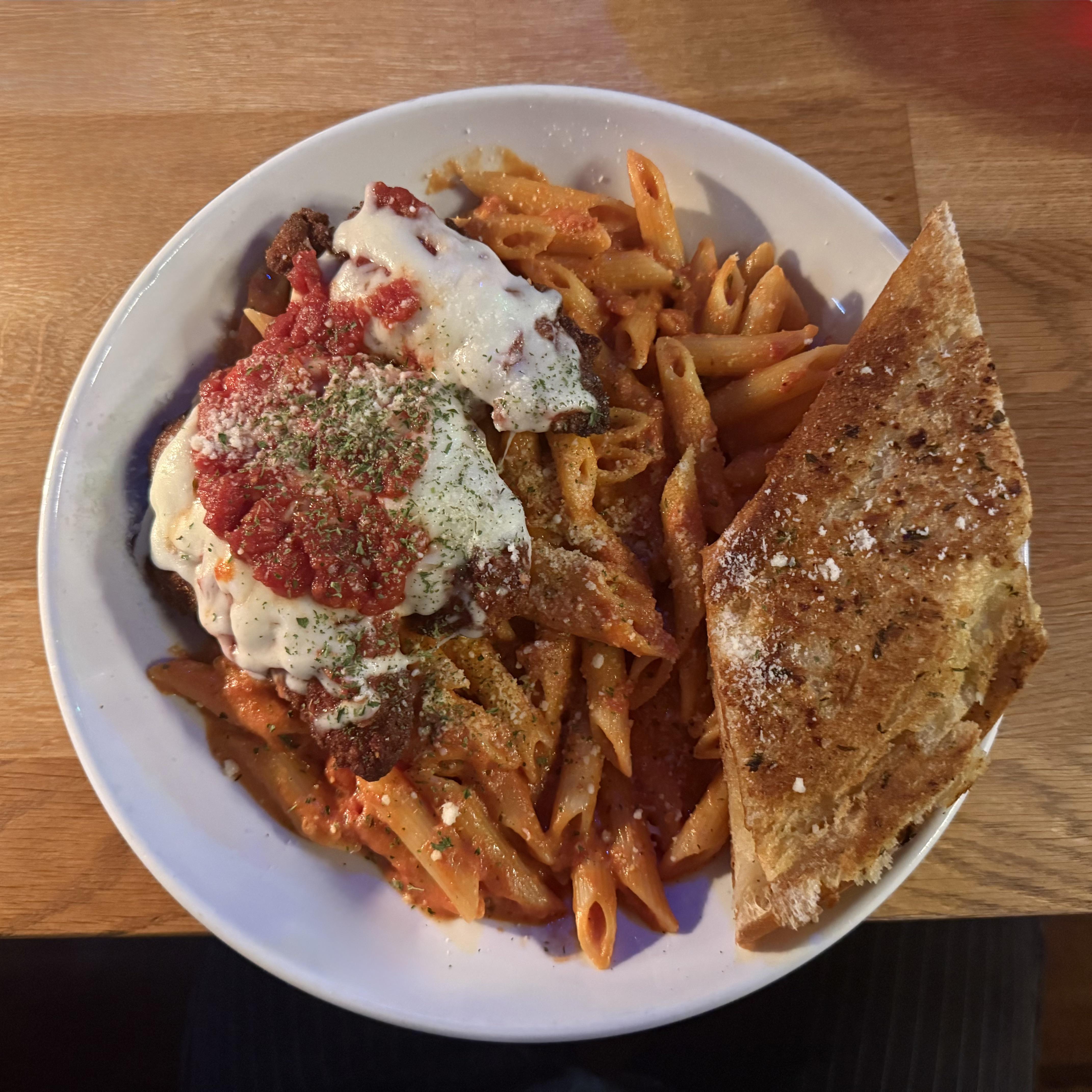 Share Facebook Twitter Pinterest LinkedIn Reddit chicken parm with penne vodka and garlic bread by armaastus Dining and Cooking