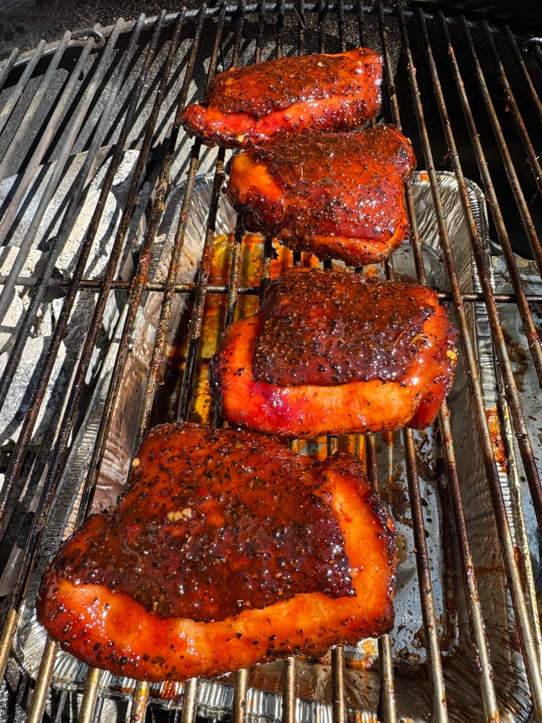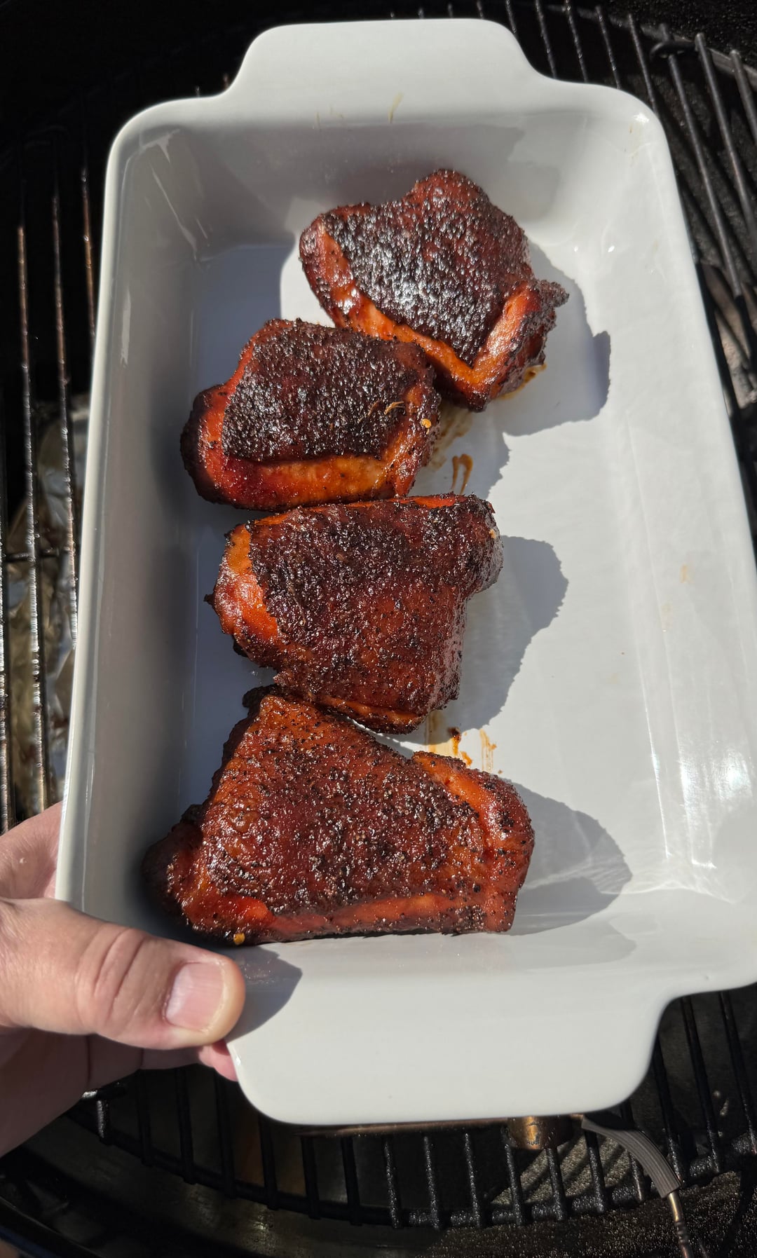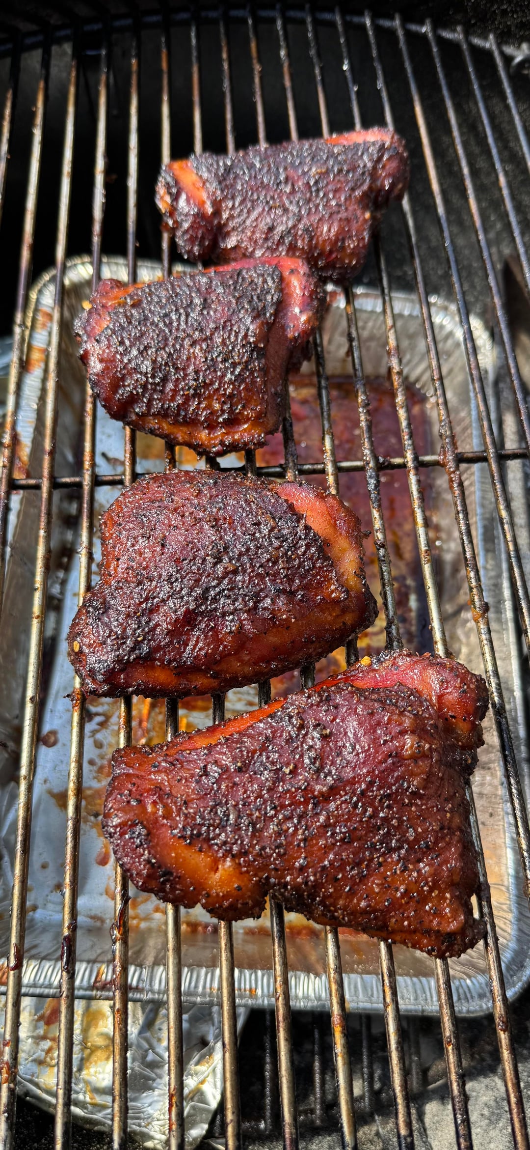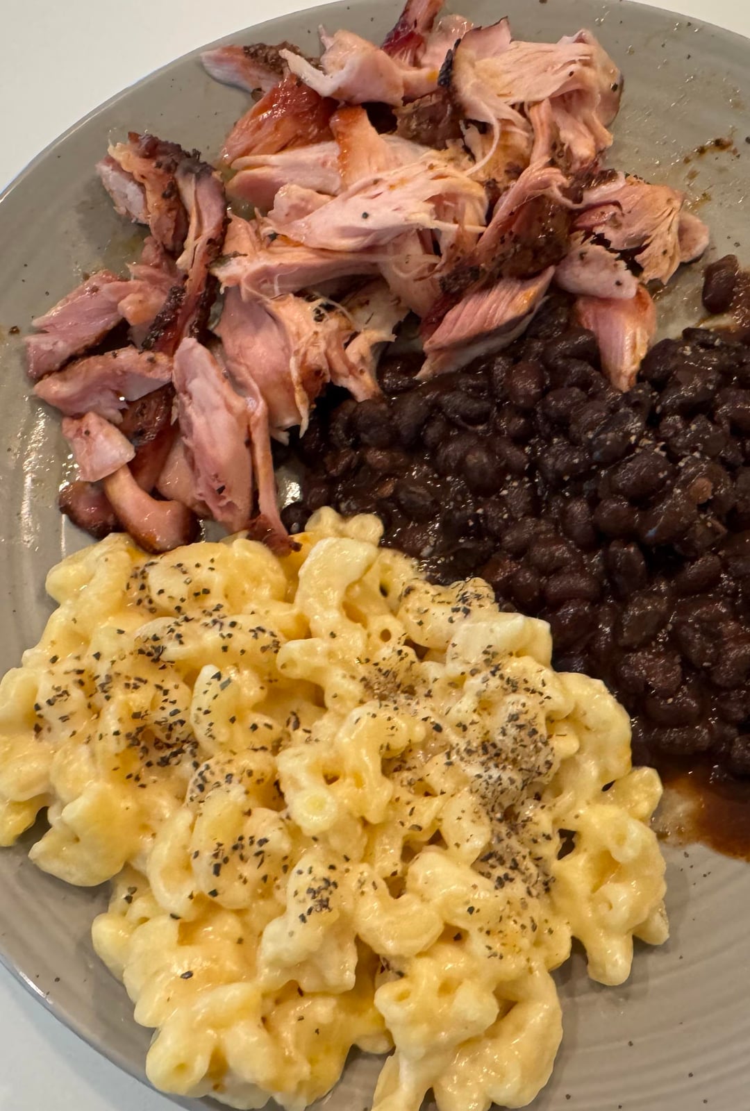 Chicken purchased at Zupan’s, my favorite places for meat. Chicken was trimmed and sprinkled with Jacobson salt and 18 mesh black pepper. Smoked using post oak wood for that quintessential Texas flavor. Once at temp, glazed with homemade spicy sauce. Made macaroni and cheese and my favorite black bean side dish.