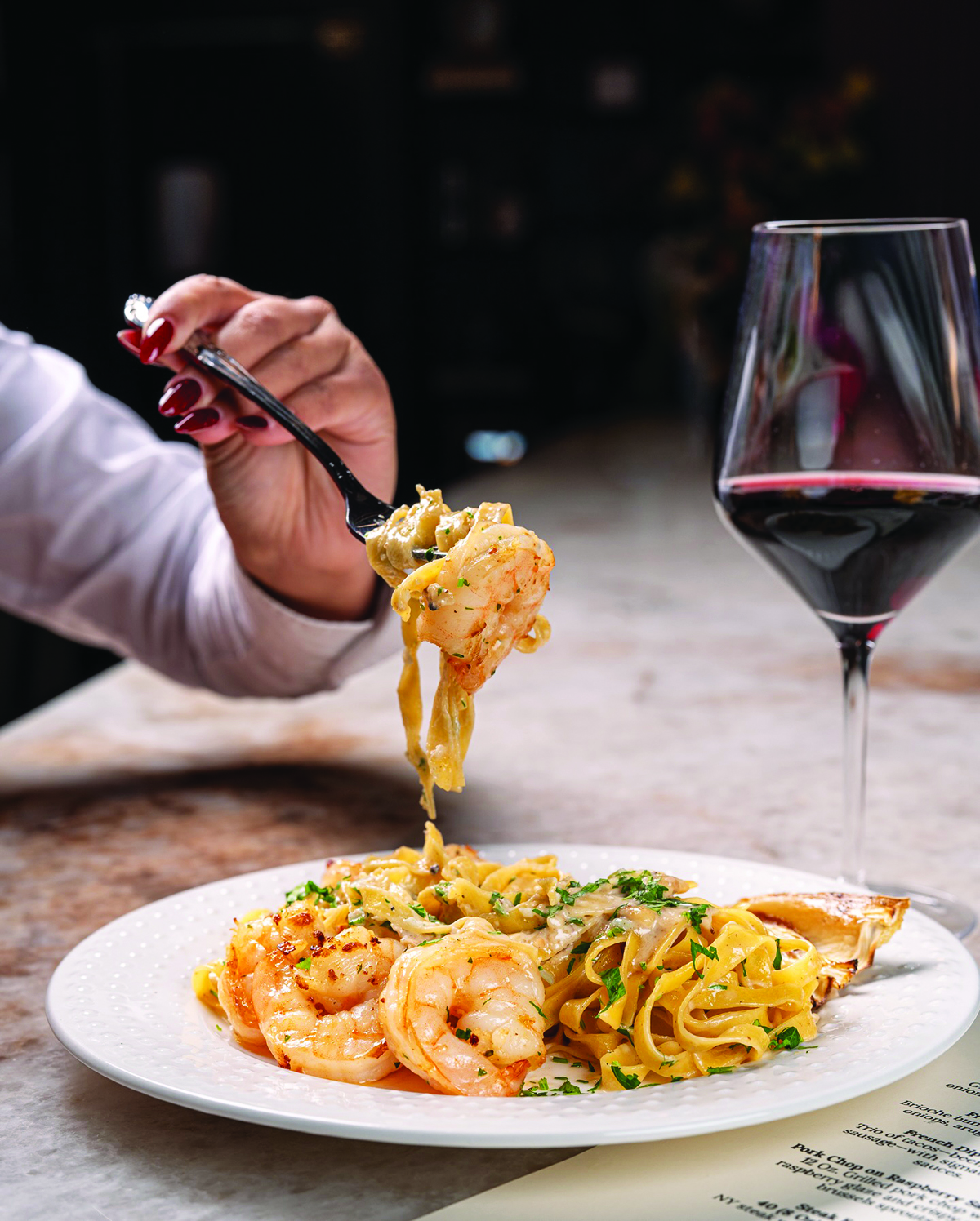 NAMED FOR THE French word for “wheat,” Blé French Bistro transformed a former Mexican eatery in the Town & Country Shopping Center into an art-filled dining room designed—with mod chandeliers, upholstered white barstools, and a splash of hot pink—to look like a sweet brasserie. The menu is a tribute to the French cuisine dear to the heart of co-owner Gabriel Di Egidio (who opened the restaurant in February with partners Frank Martinez, Rogelio Mancillas, and Gabriella Di Pietro). Di Egidio’s late father-in-law was from Lyon, France, widely considered the country’s gastronomic capital. “We spent a lot of time with him, and it left a lasting impression,” says Di Egidio, who is originally from Venezuela. “We wanted to open a space that honored that heritage.” Di Egidio says his father-in-law’s favorite French onion soup was a menu requirement. Here, the gooey dish is loaded with deeply caramelized onions and is presented in a pretty stemmed crock with a molten cheese crown.