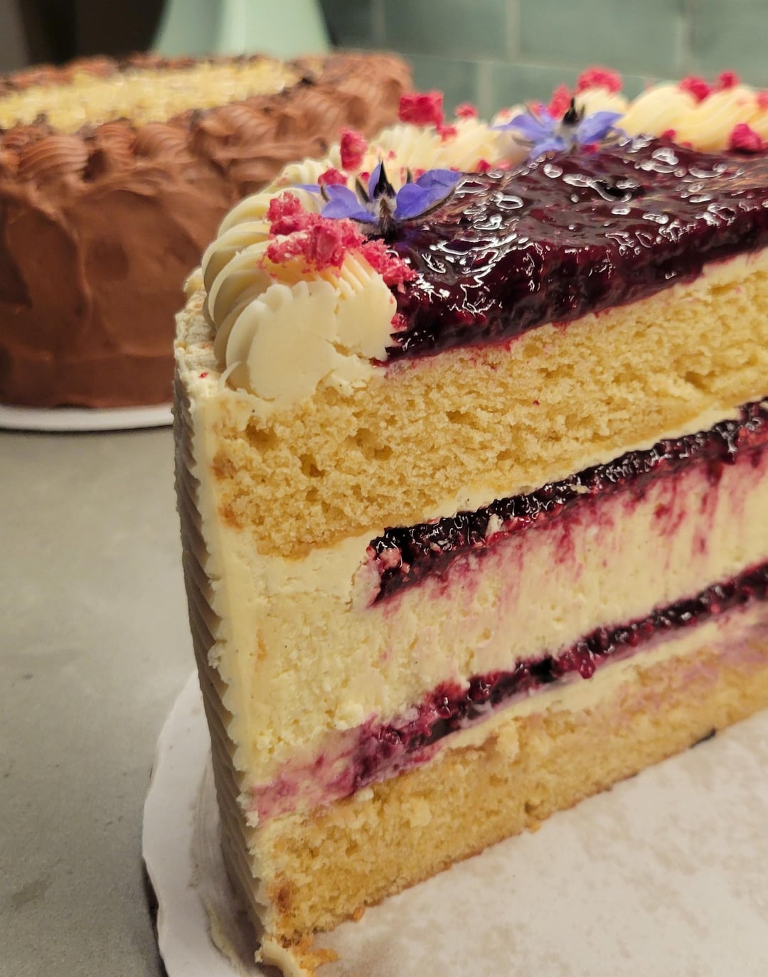 I've been seeing layer cakes that have a whole cheesecake layered in there, and I finally made one! Really happy with it, and excited to try different flavor combos. This one has vanilla cake, vanilla cheesecake, mixed berry (raspberry-blackberry-blueberry) compote, and a German buttercream. I think some citrus curd would be so good to include as well.