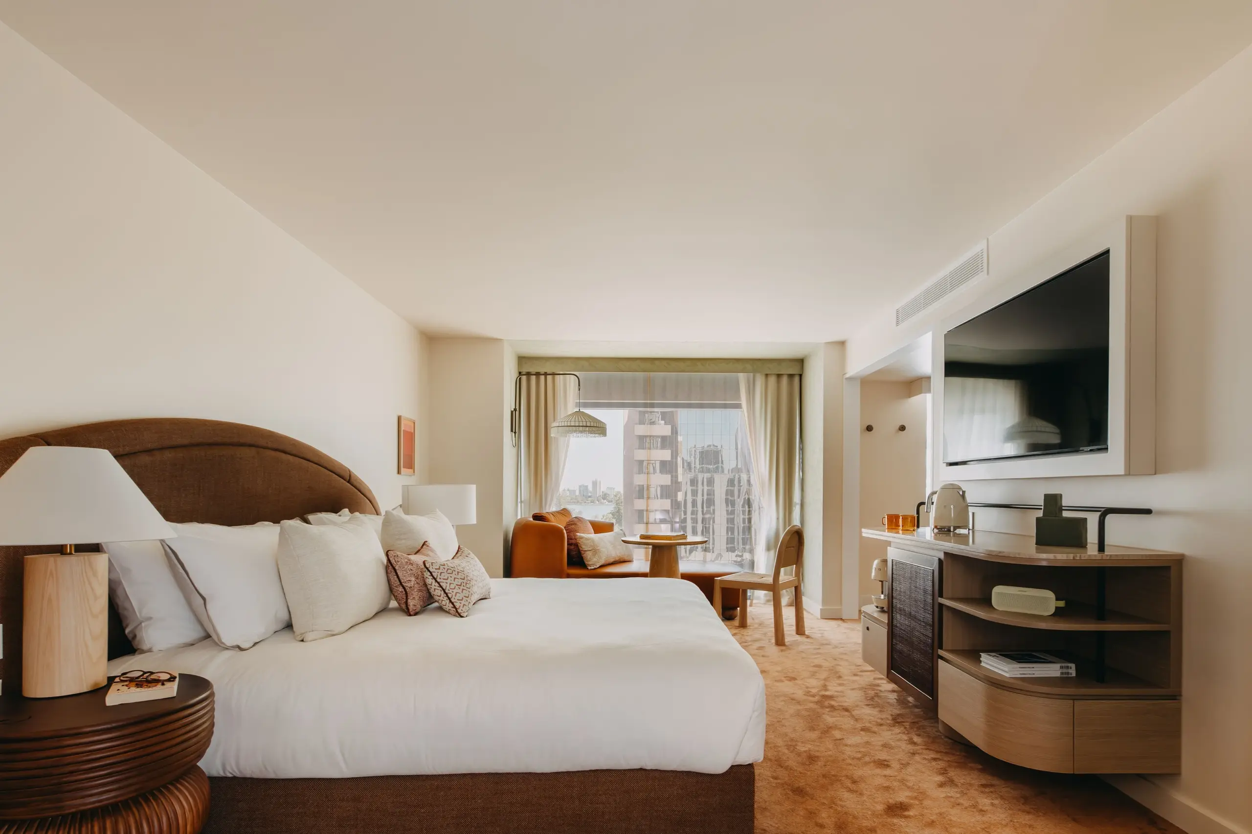 Beyond the lobby, Hyde Perth’s rooms and suites align with the brand’s signature bohemian luxury style. Earthy tones, handcrafted Pampa rugs, and custom furnishings, including cushions from Jimmy Pike, Patricia Braune, and Grace Garret, add warmth and lived-in elegance to the space.