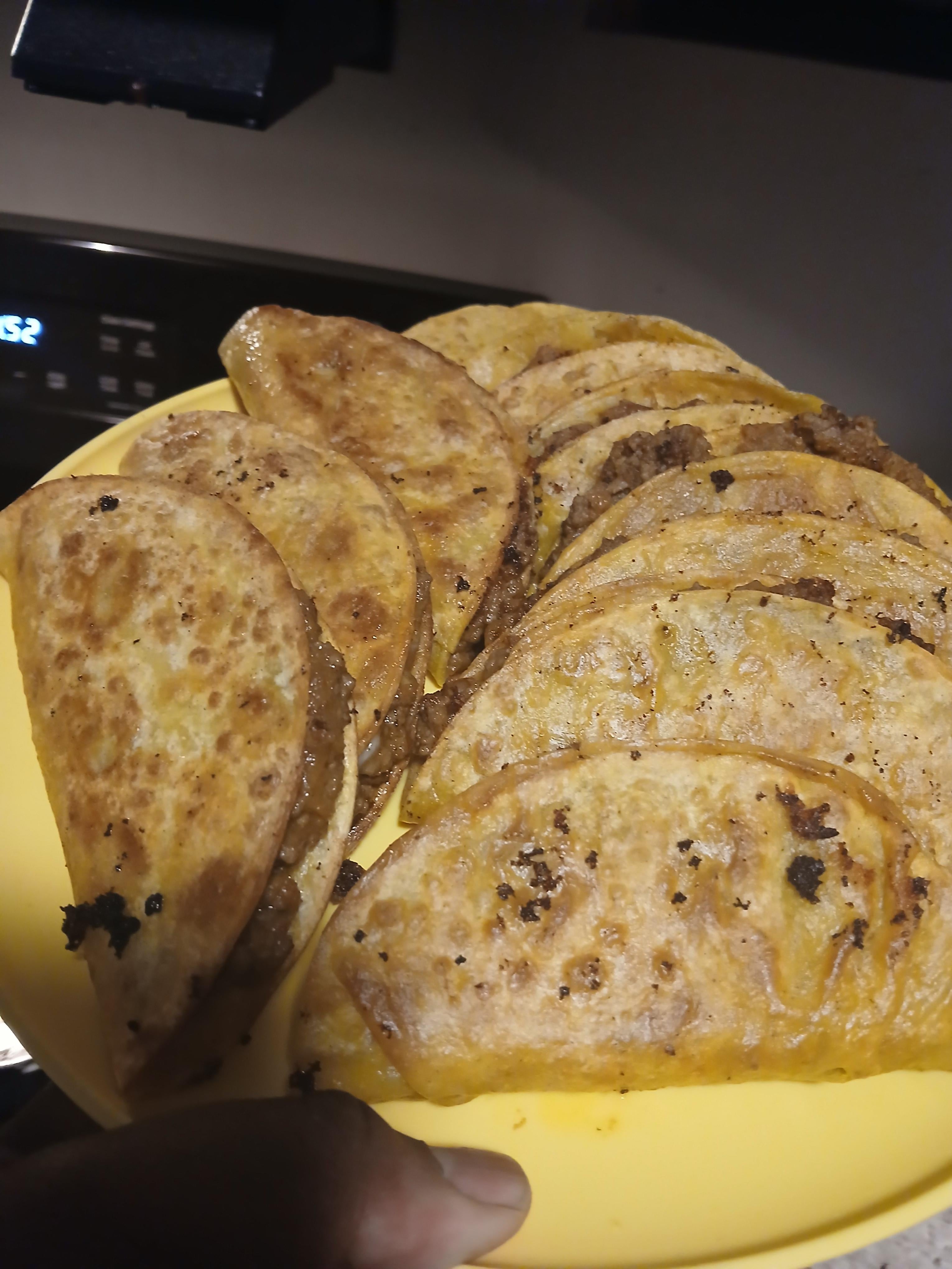 Share Facebook Twitter Pinterest LinkedIn Reddit Seasoned beef with refried beans and cheese. Throw a little salsa verde on em. Split it with my brothers. They loved it. by Own-Independence-662 Dining and Cooking