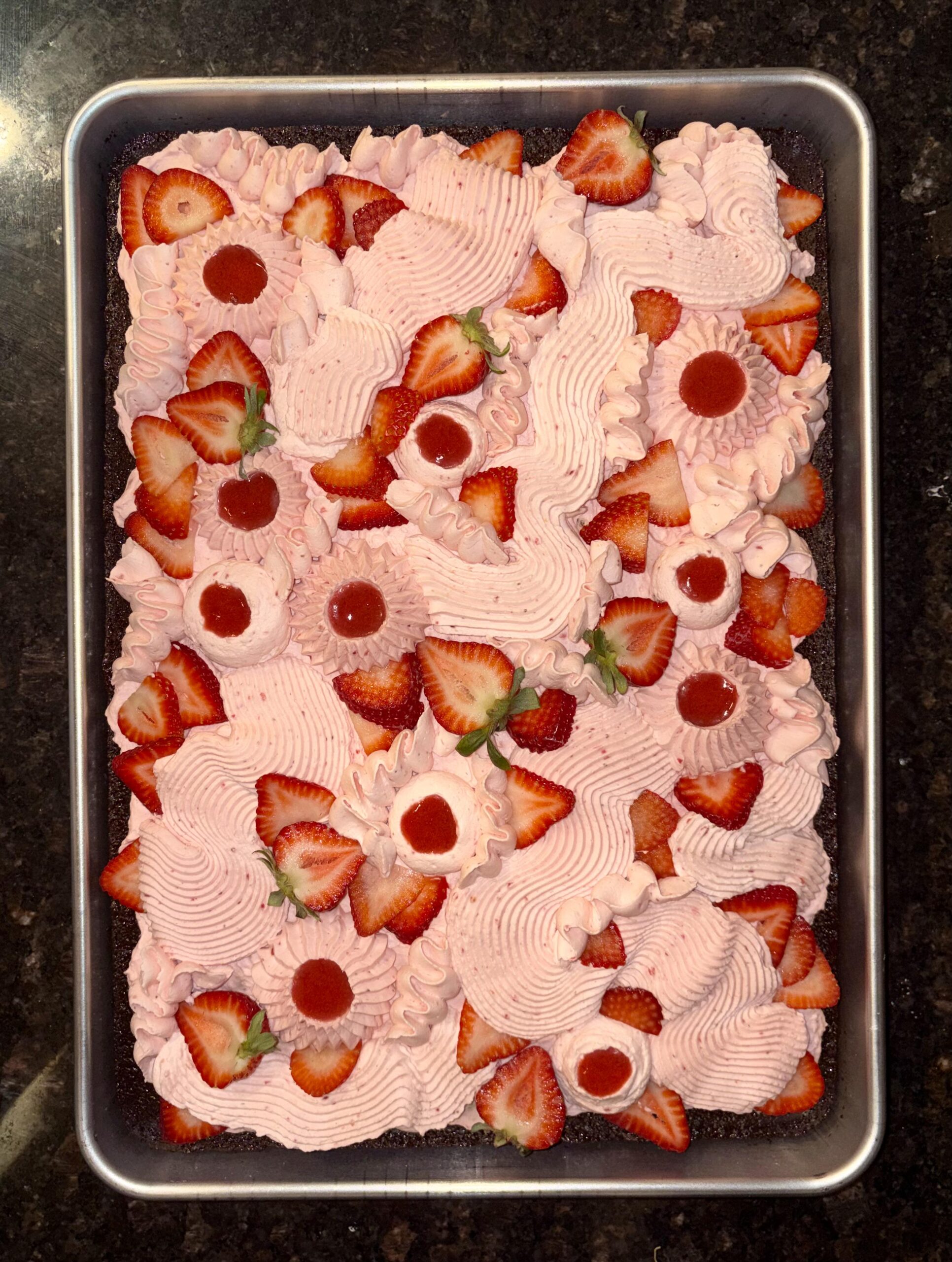 Chocolate sheet cake (recipe from Preppy Kitchen), whipped cream with freeze dried strawberries and vanilla instant pudding mix to stabilize, and strawberry compote. Made for a neighborhood get-together!