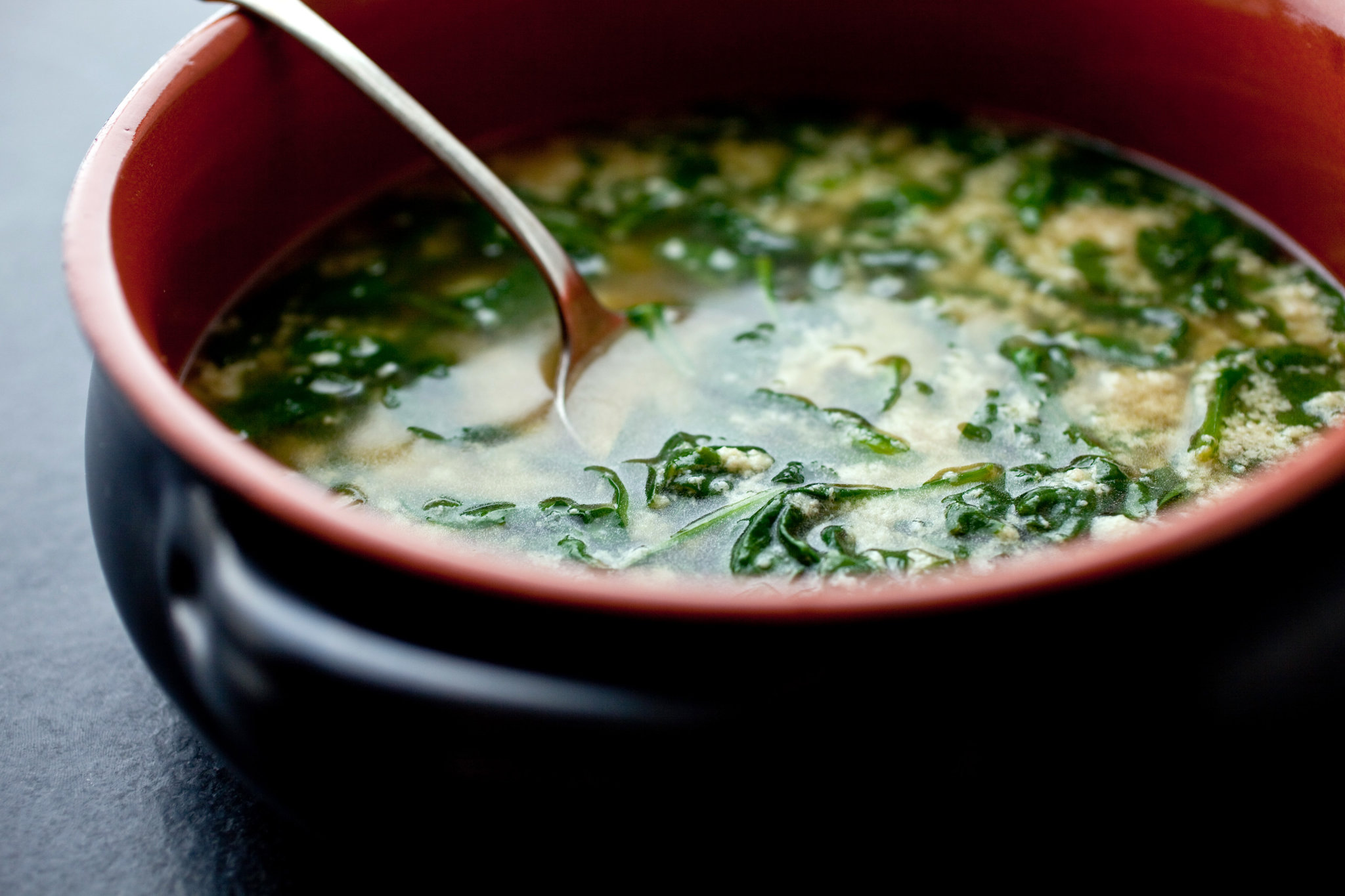 - Stir the spinach into the simmering stock, then drizzle in the egg mixture, scraping all of it in with a rubber spatula. Stir very slowly with the spatula, paddling it back and forth until the little “rags” form. Taste, adjust seasoning and serve at once.
