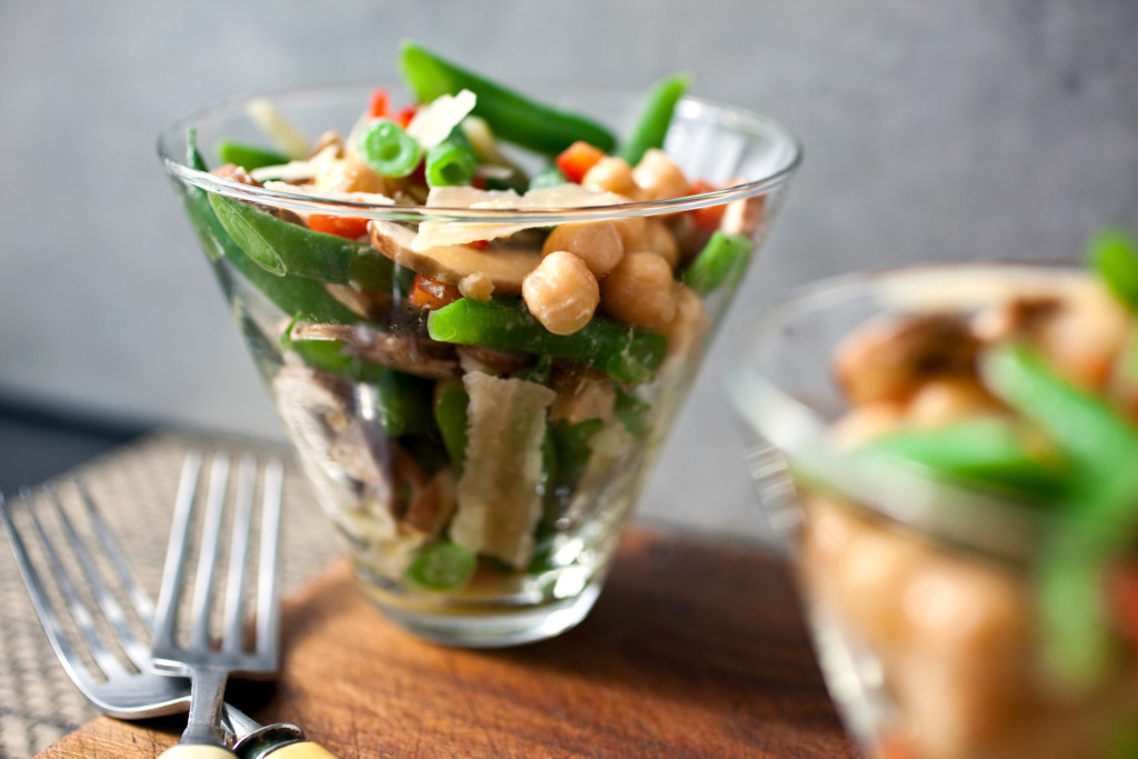 - Combine the beans, mushrooms, chickpeas, Parmesan and herbs in a salad bowl. In a small bowl or measuring cup, whisk together the lemon juice, vinegar, salt, mustard and garlic. Whisk in the olive oil.