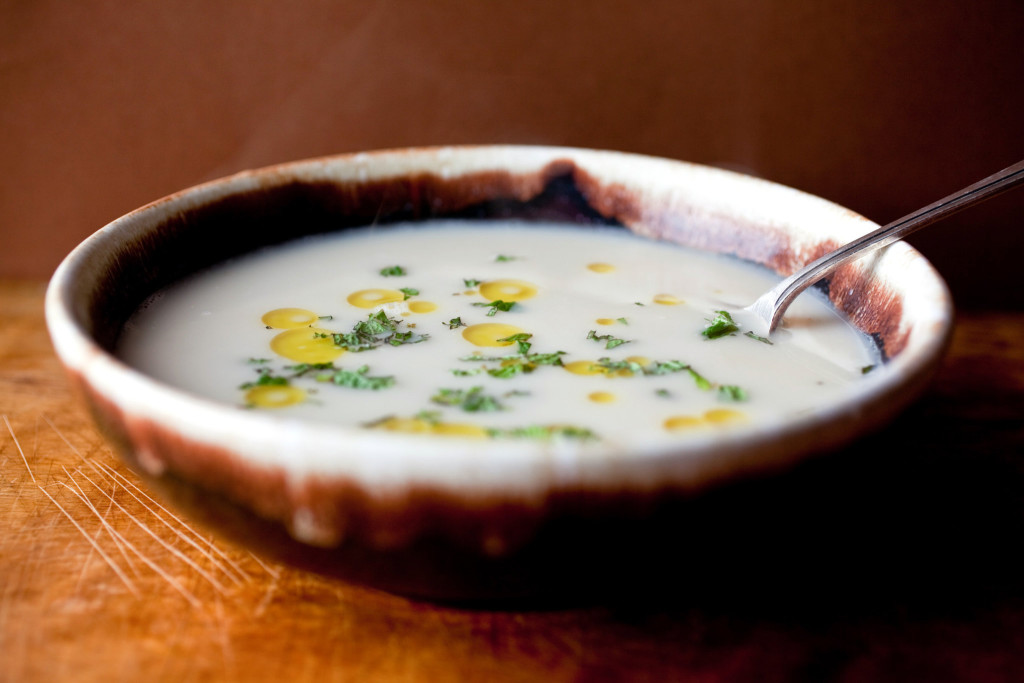 3. Puree the soup in a blender (in small batches, covering the top with a dish towel to avoid hot splashes) or with an immersion blender until smooth. Put through a strainer for a very smooth texture, pushing it through with the bottom of a ladle or a spatula. Return to the pot, and heat through, stirring the bottom and sides of the pot so that the puree doesn’t stick. Stir in the remaining tablespoon of olive oil and the lemon juice. Taste and adjust seasonings.